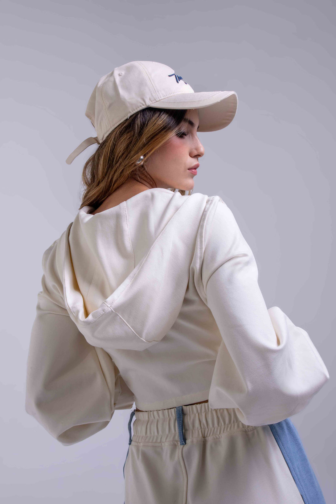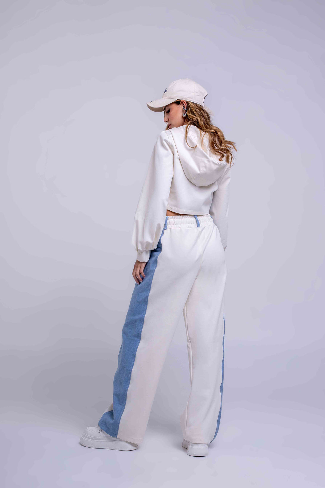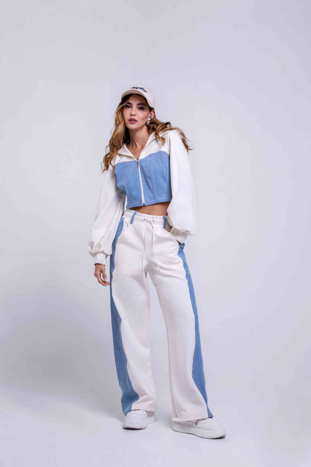 Crop jacket con cremallera frontal y mangas globo en contraste blanco con denim azul, y un pantalón jogger de silueta relaxed con pretina elástica y cordón ajustable, que integra bloques en denim a los costados para un efecto visual moderno y estilizado.