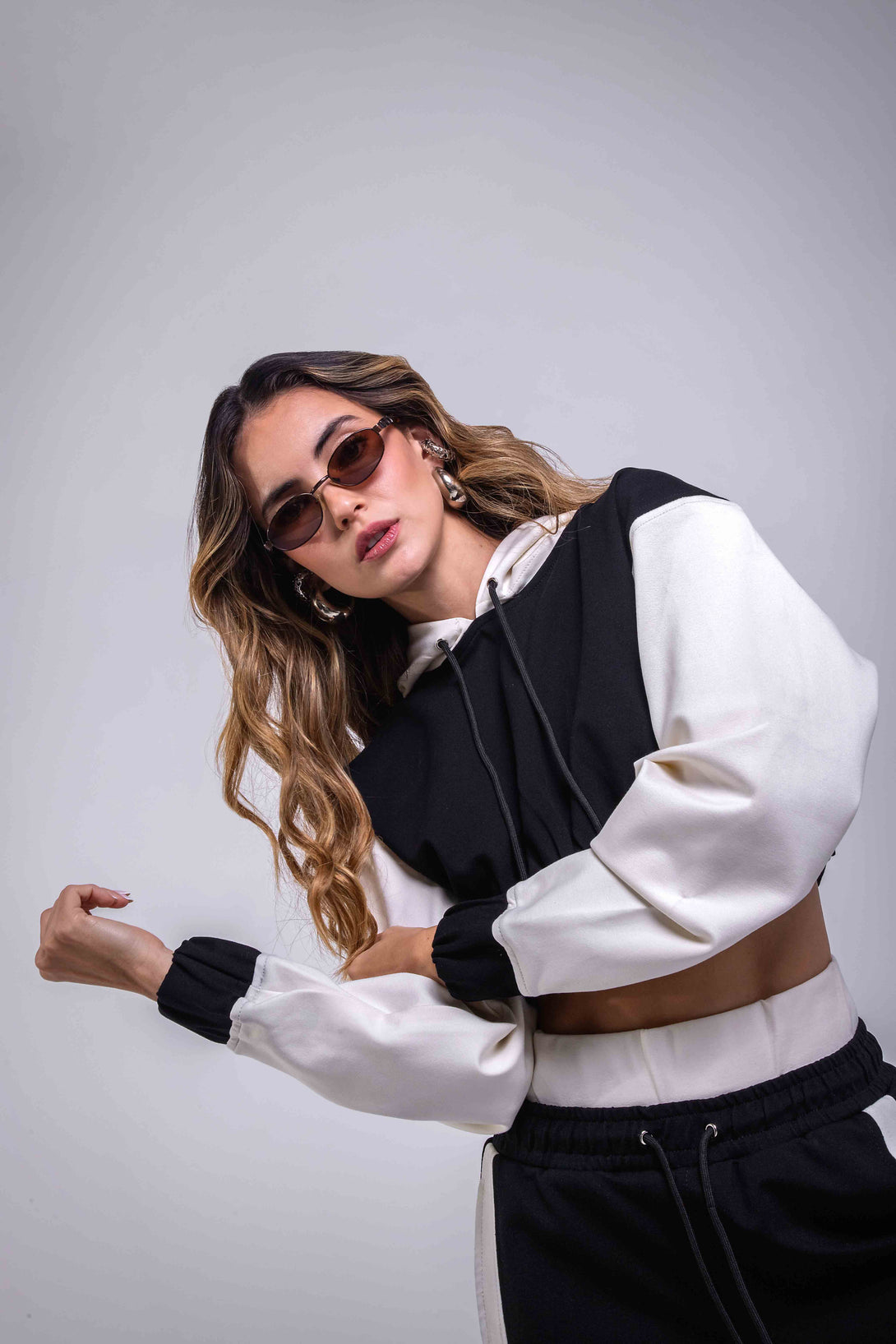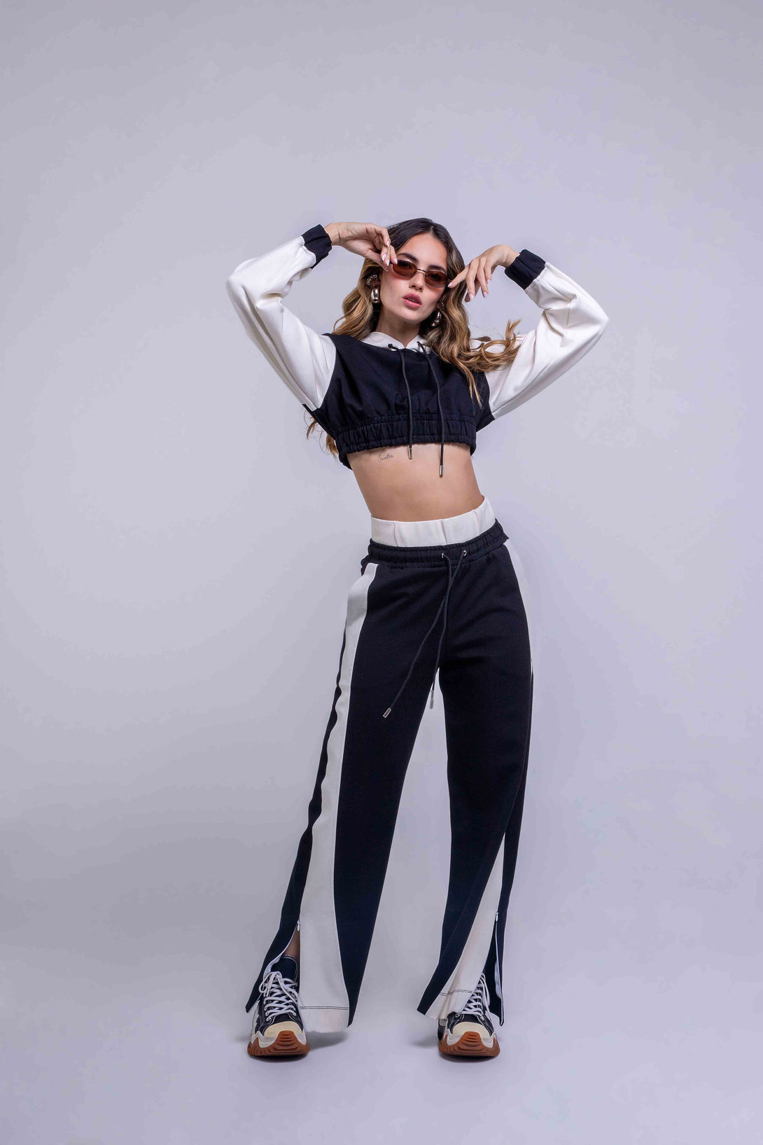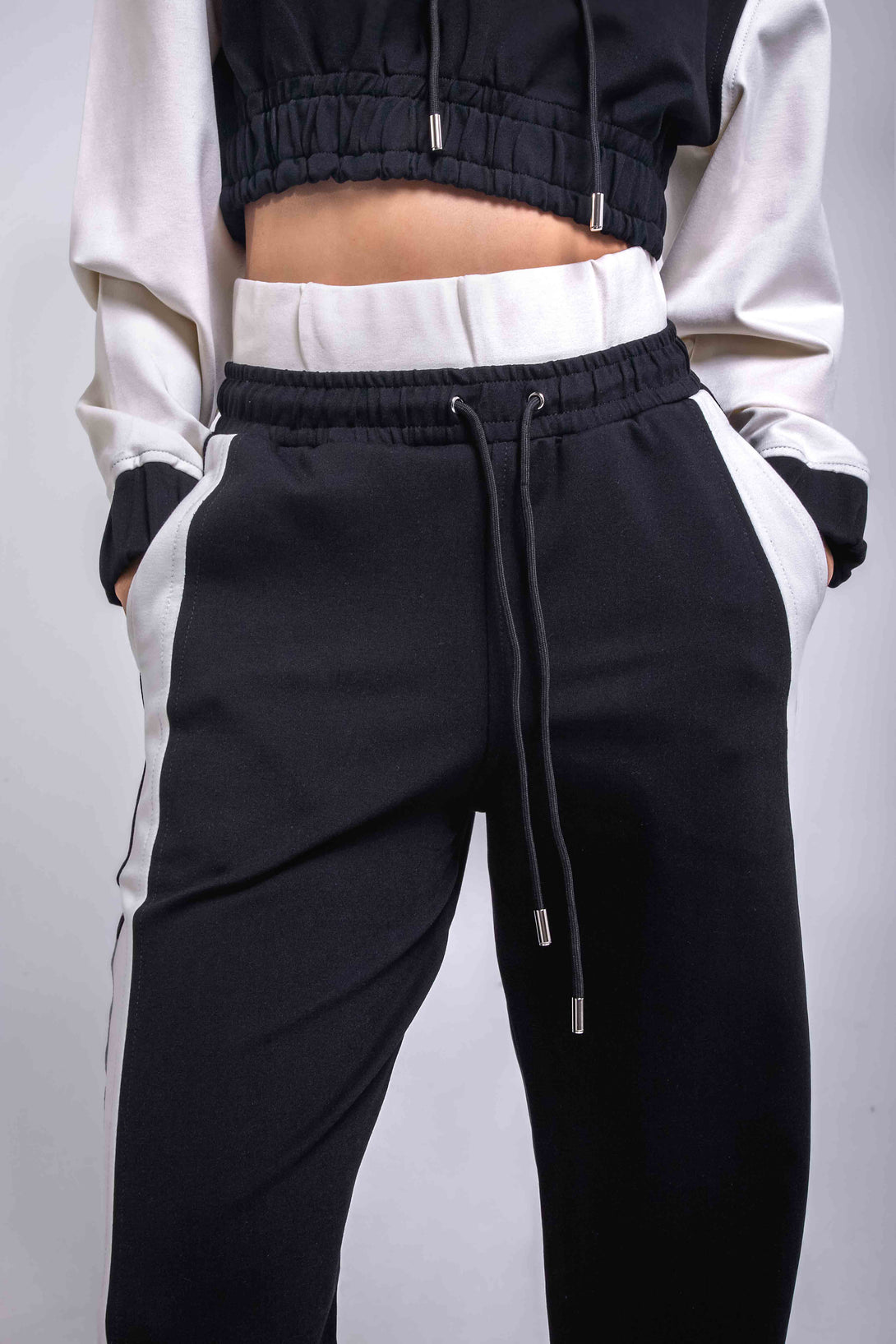 hoodie crop con capucha y ajuste elástico en la pretina, en contraste de negro con mangas blancas, y un pantalón jogger wide leg de tiro medio con pretina ajustable, que integra bloques bicolor a los costados para un efecto visual estilizado y moderno.