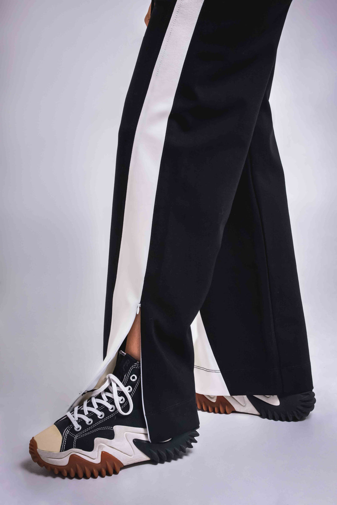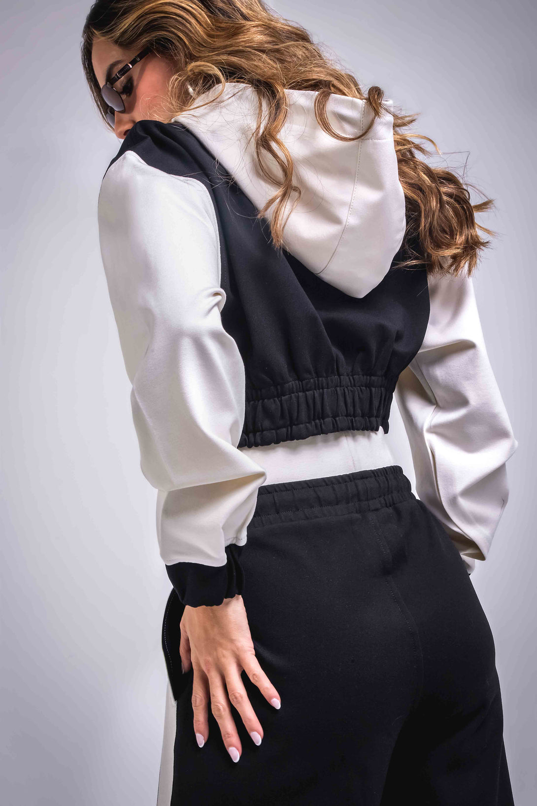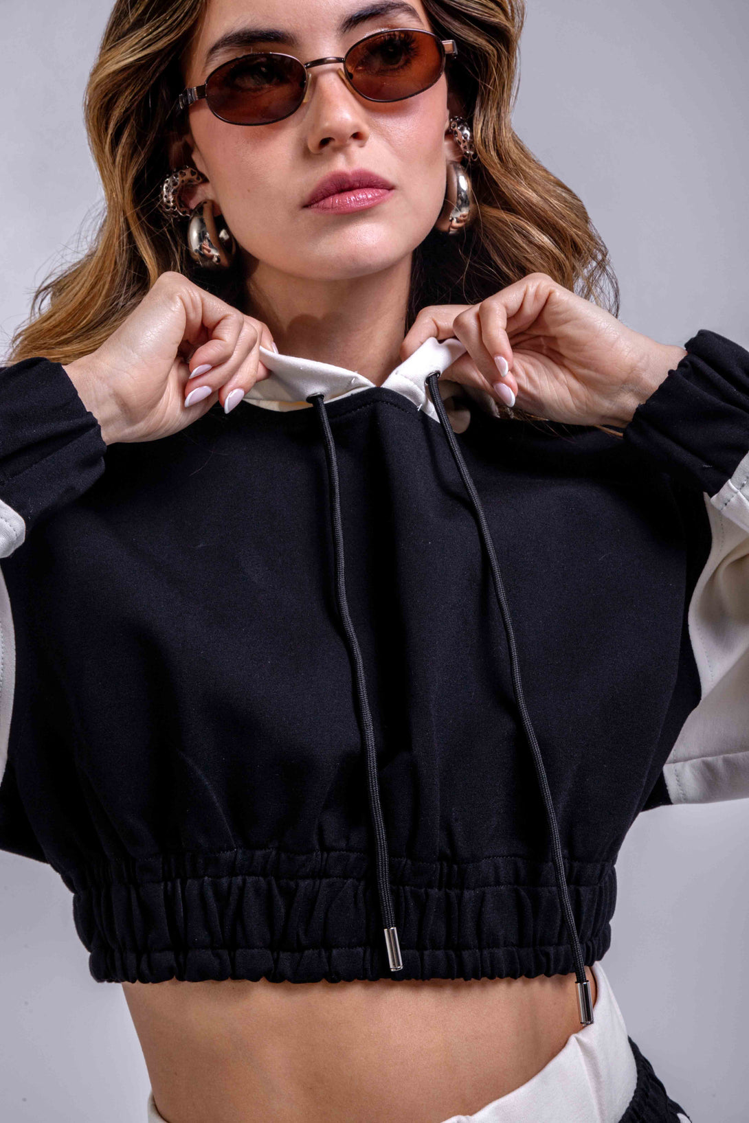 hoodie crop con capucha y ajuste elástico en la pretina, en contraste de negro con mangas blancas, y un pantalón jogger wide leg de tiro medio con pretina ajustable, que integra bloques bicolor a los costados para un efecto visual estilizado y moderno.
