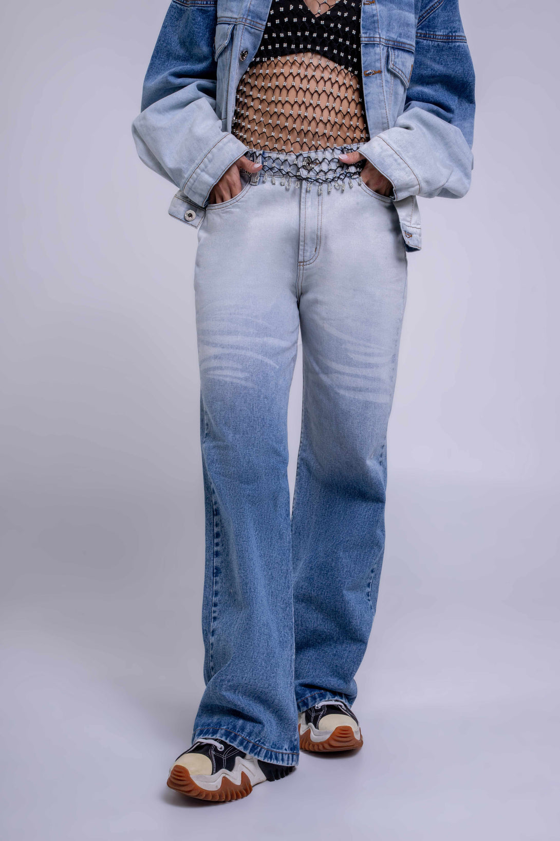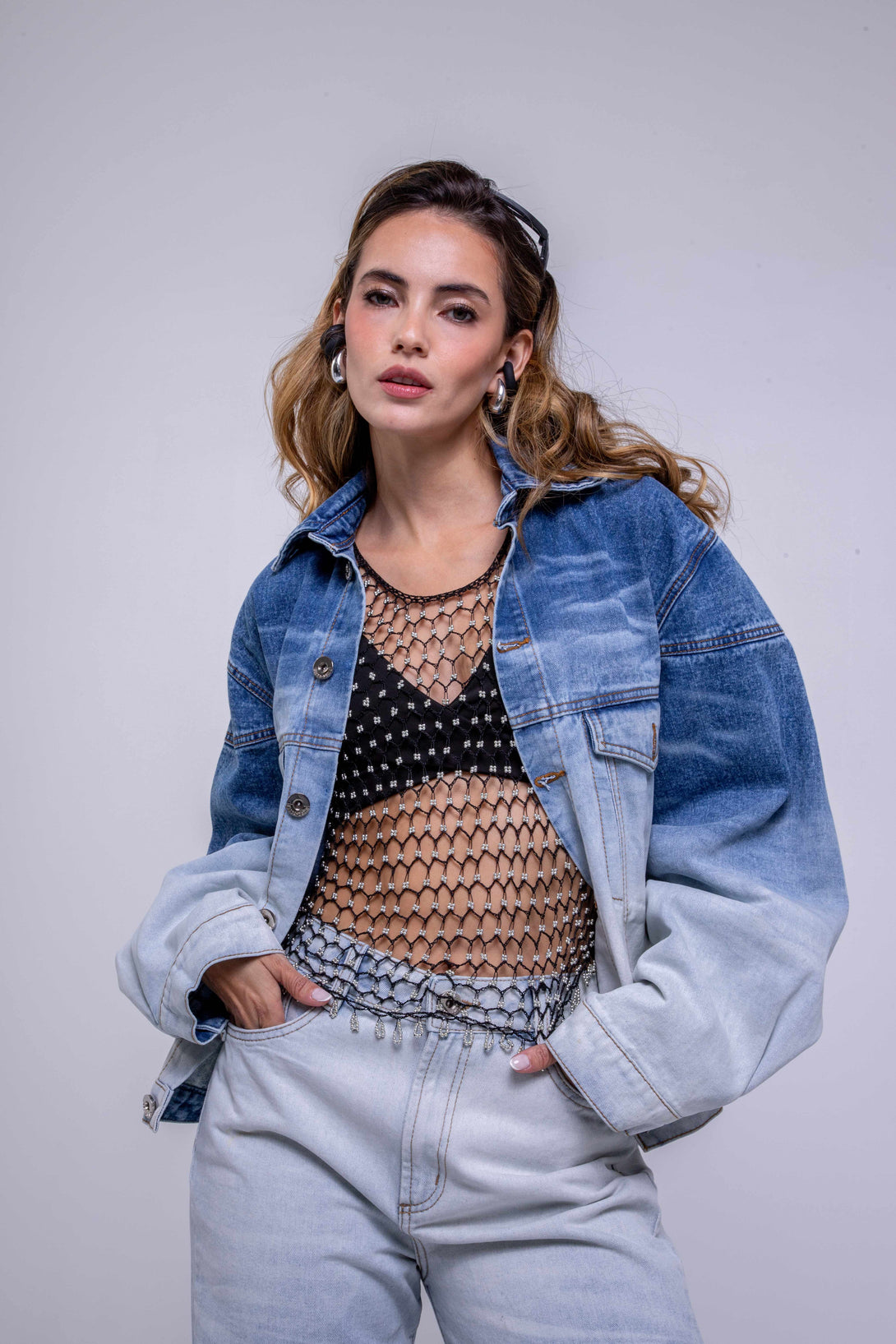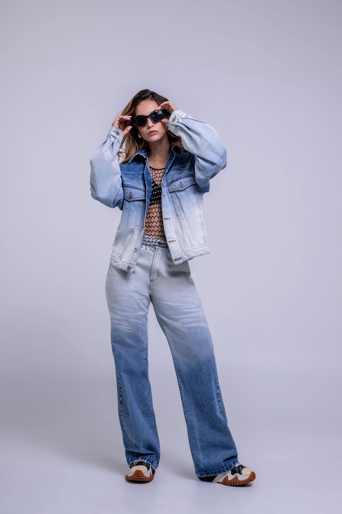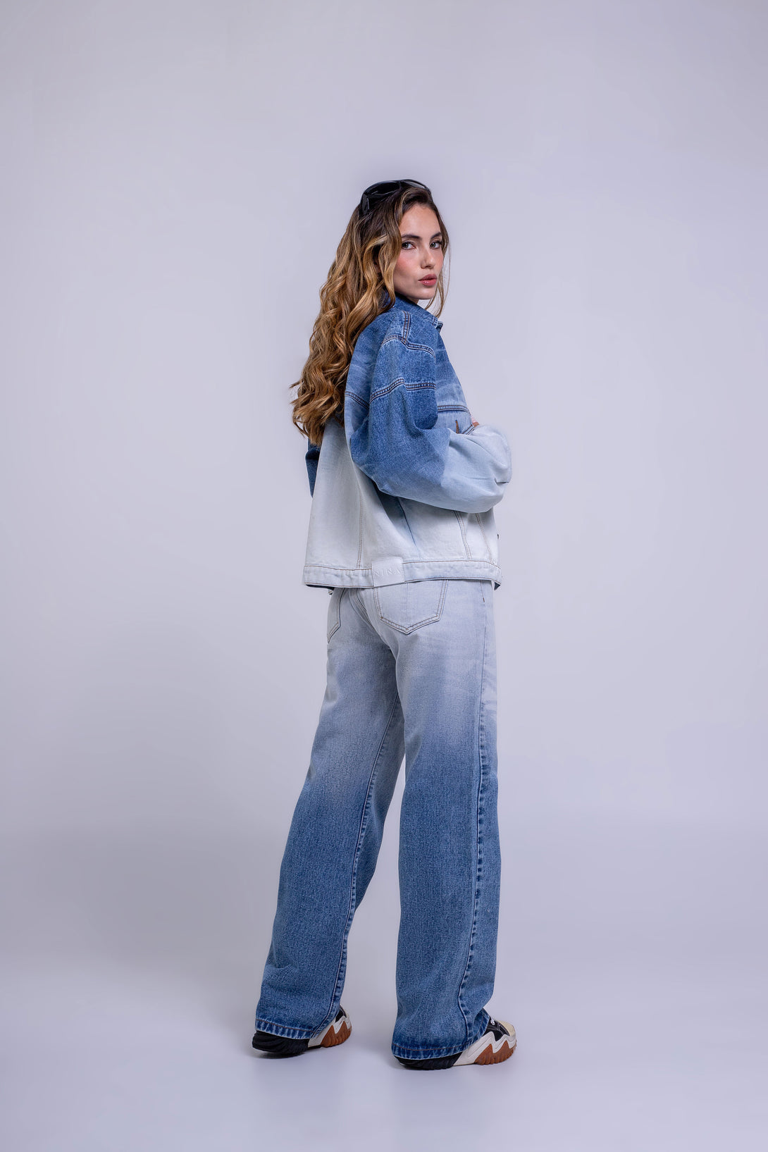 El conjunto está compuesto por una chaqueta denim oversize con efecto degradé en tonos índigo y azul claro, que aporta dimensión y frescura, y un pantalón wide leg a juego, diseñado para estilizar la silueta con comodidad y actitud.