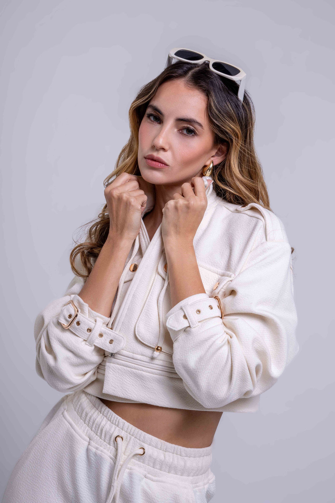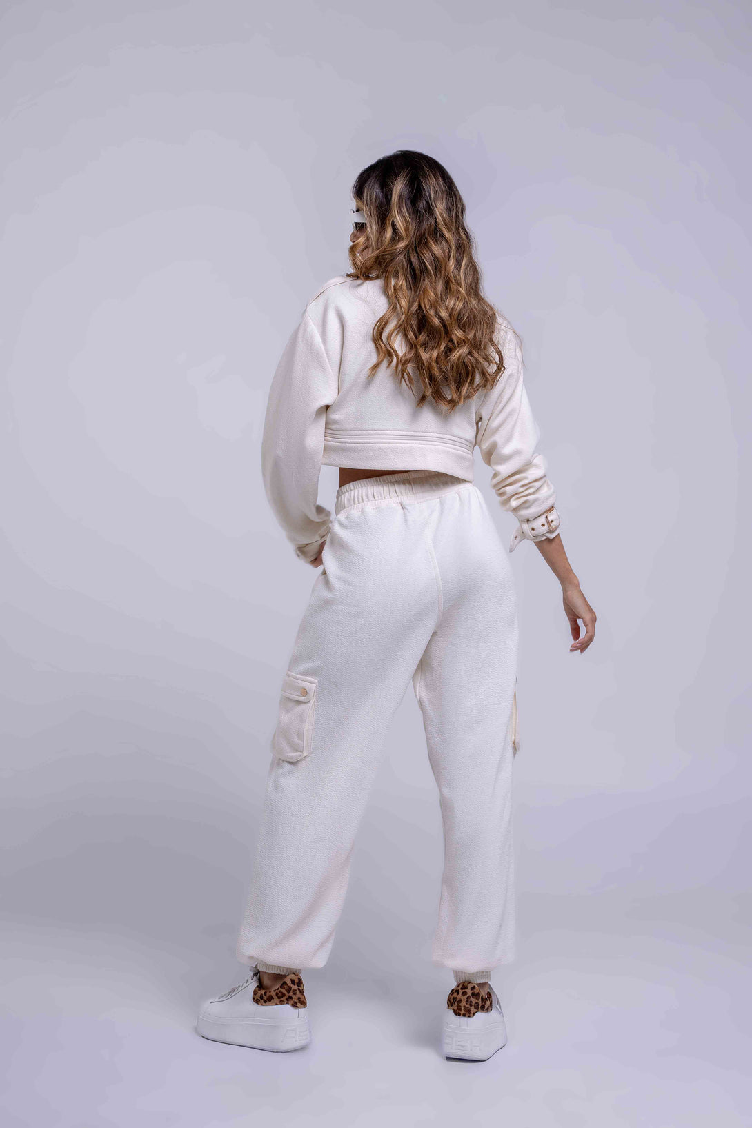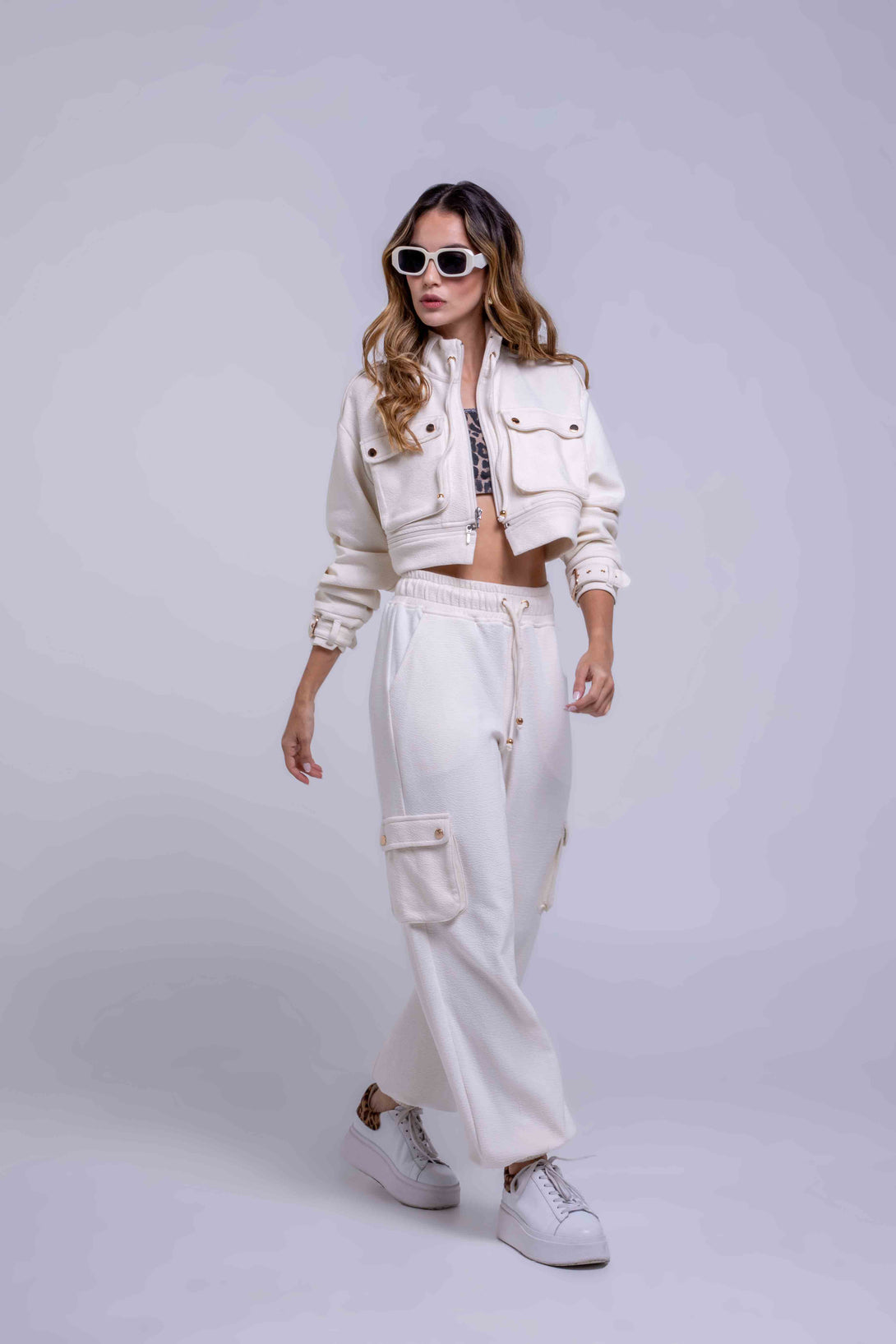 Chaqueta crop con bolsillos frontales y cierre metálico, confeccionada en textura suave con estructura ligera, y un pantalón cargo wide leg de pretina elástica y cordón ajustable, con bolsillos laterales de tapa que refuerzan su aire utilitario.