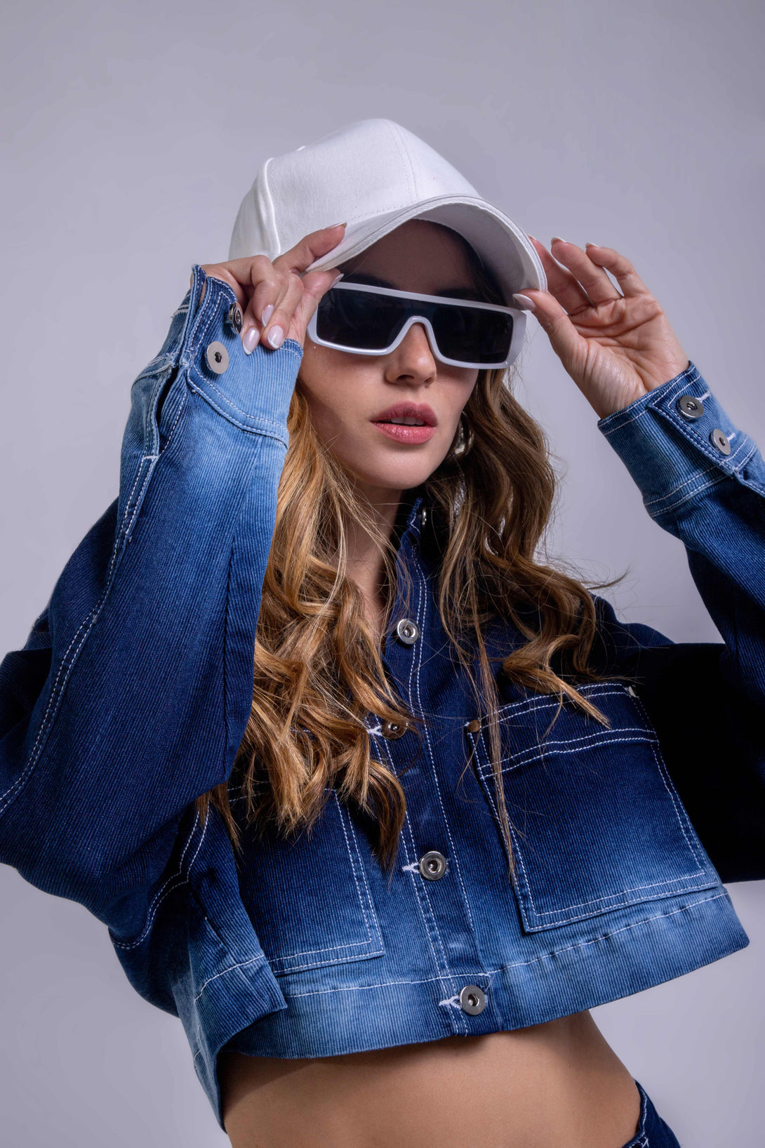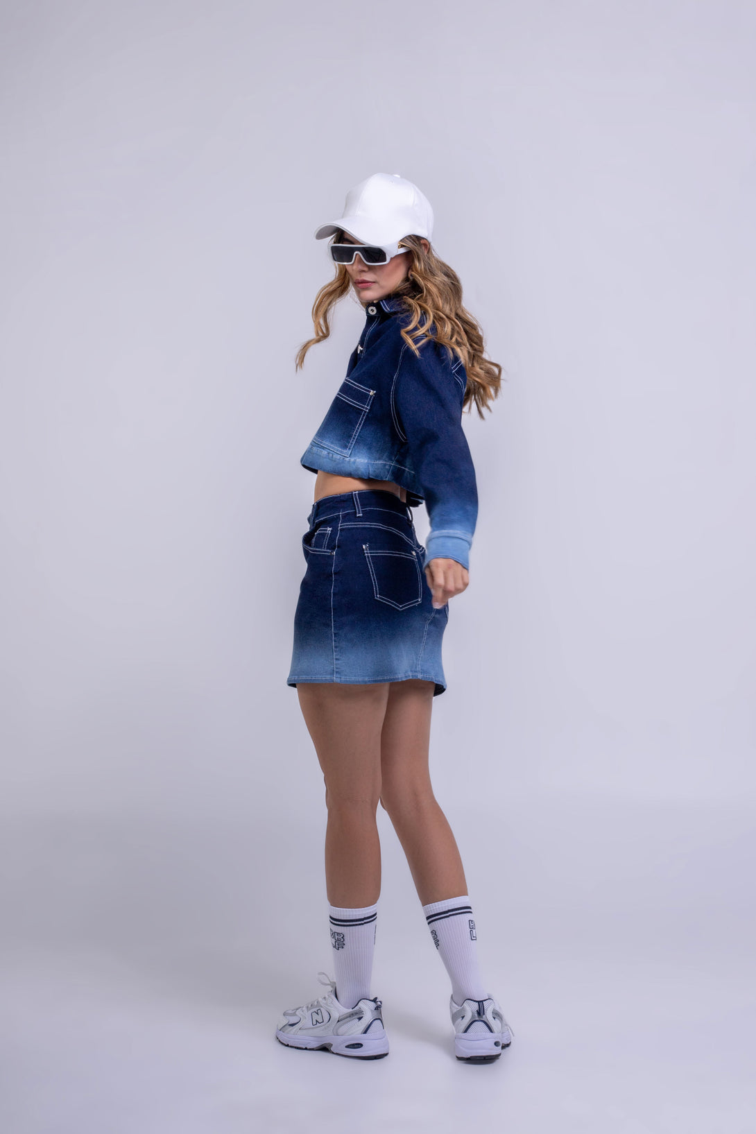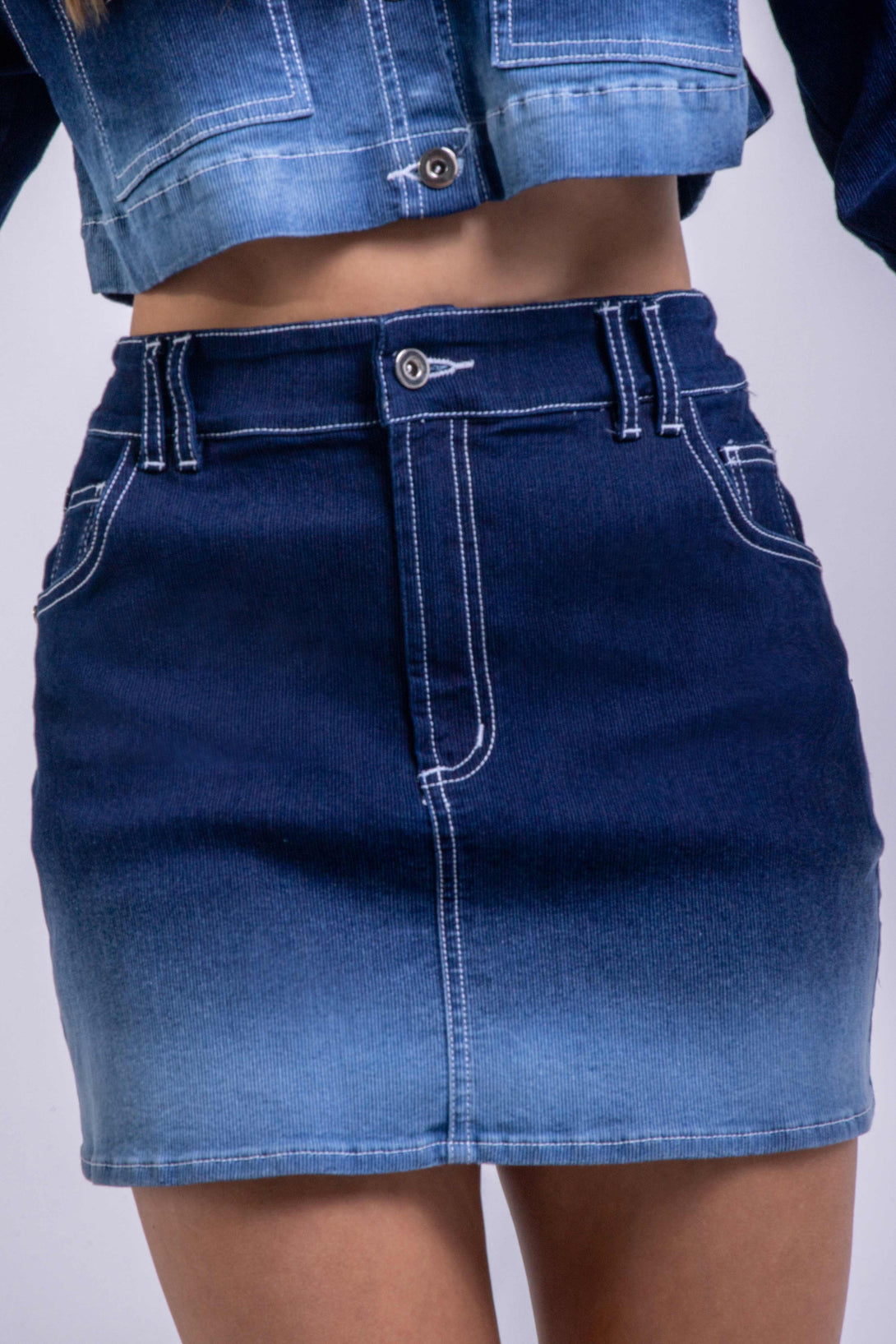 Chaqueta crop en denim con bolsillos frontales y acabado degradé, combinada con una falda mini recta que sigue la misma técnica de lavado en tonos azul oscuro a azul claro.