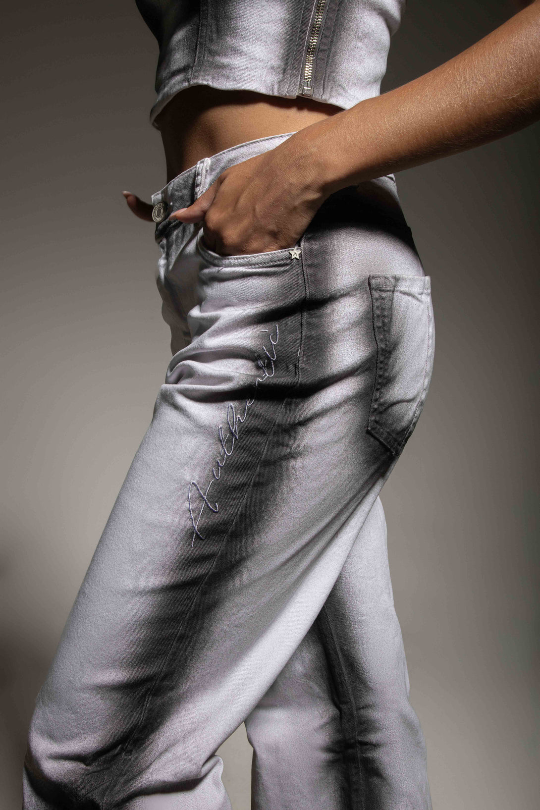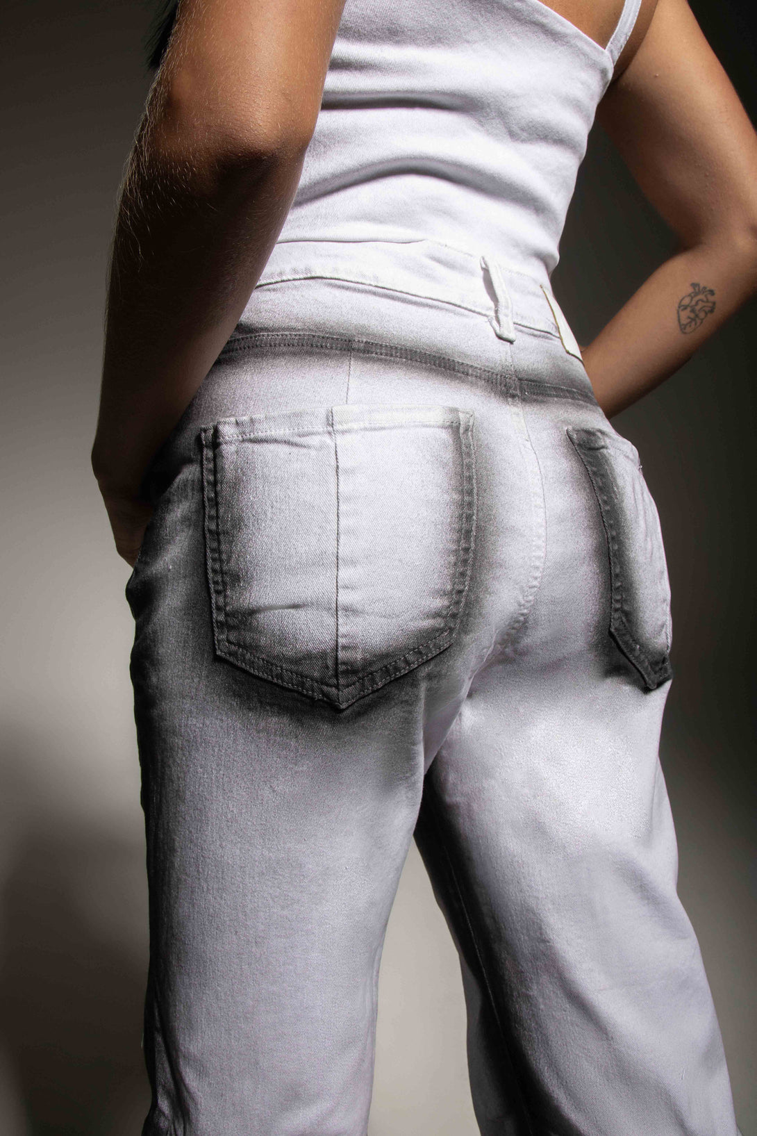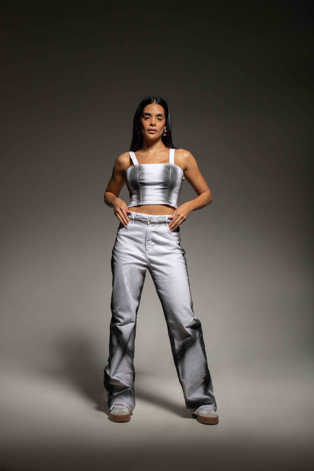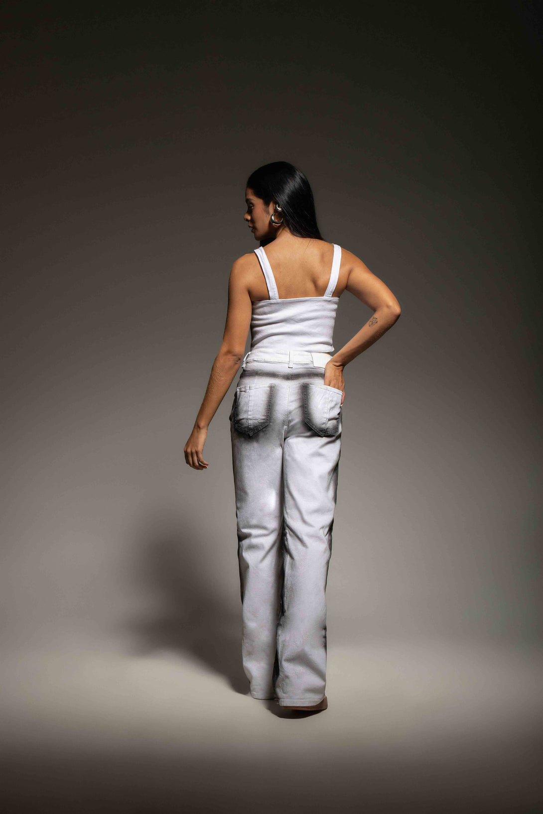 crop top de tiras rectas y jean silueta wide leg, ambos elaborados en denim 100% algodón de tacto suave. El proceso de lavandería con aerógrafo crea un efecto degradado vertical que estiliza la figura y convierte cada prenda en una pieza única.