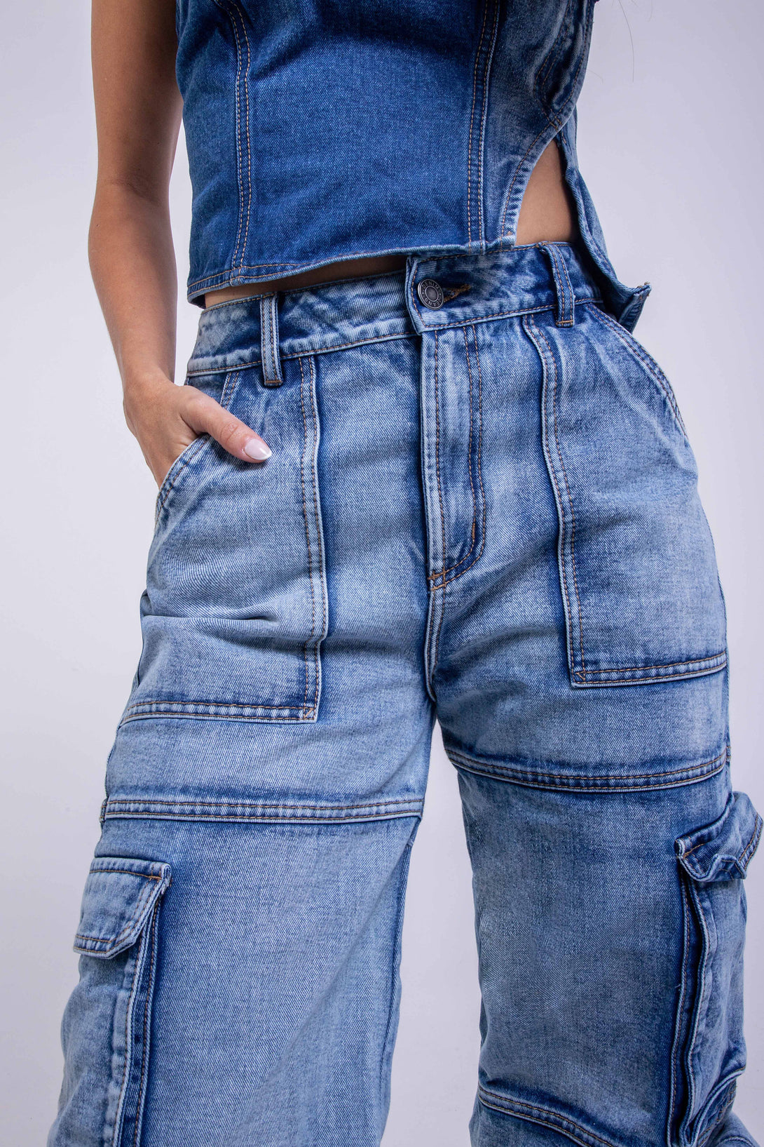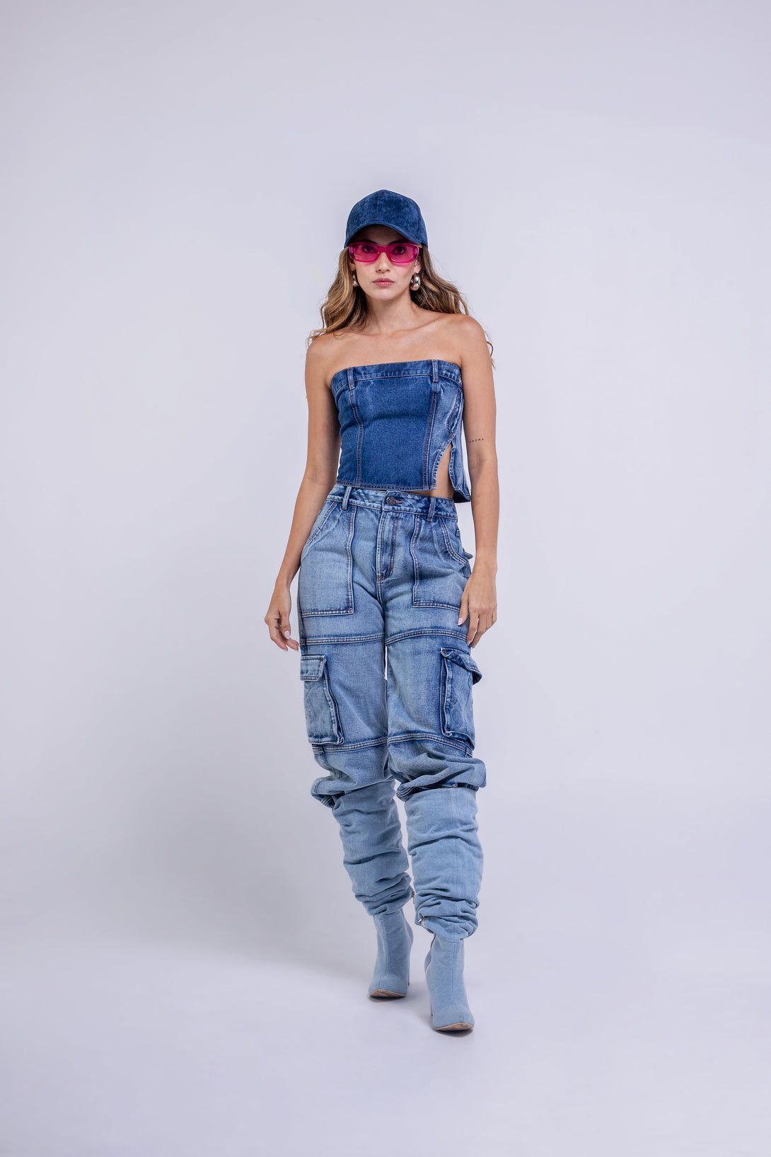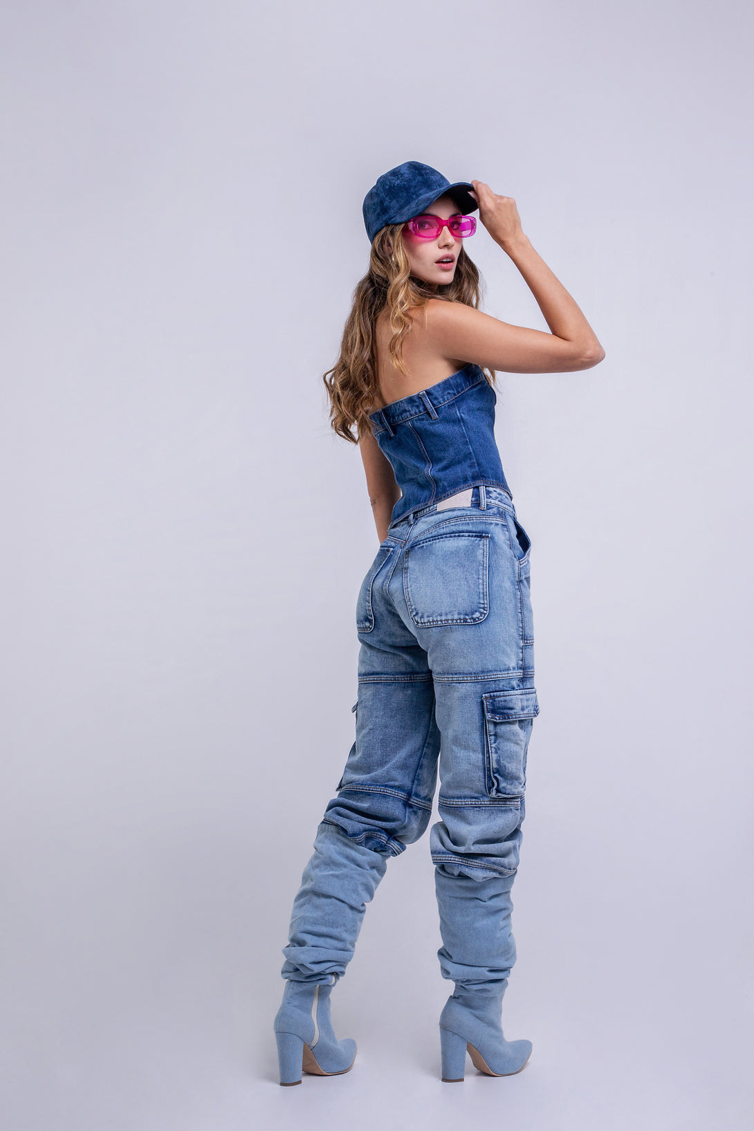 Corset strapless en denim de lavado medio, con cortes estructurados y abertura lateral, que resalta la silueta con un aire sofisticado, y un pantalón cargo tipo jogger con múltiples bolsillos, costuras marcadas que aporta actitud utilitaria y vanguardista.