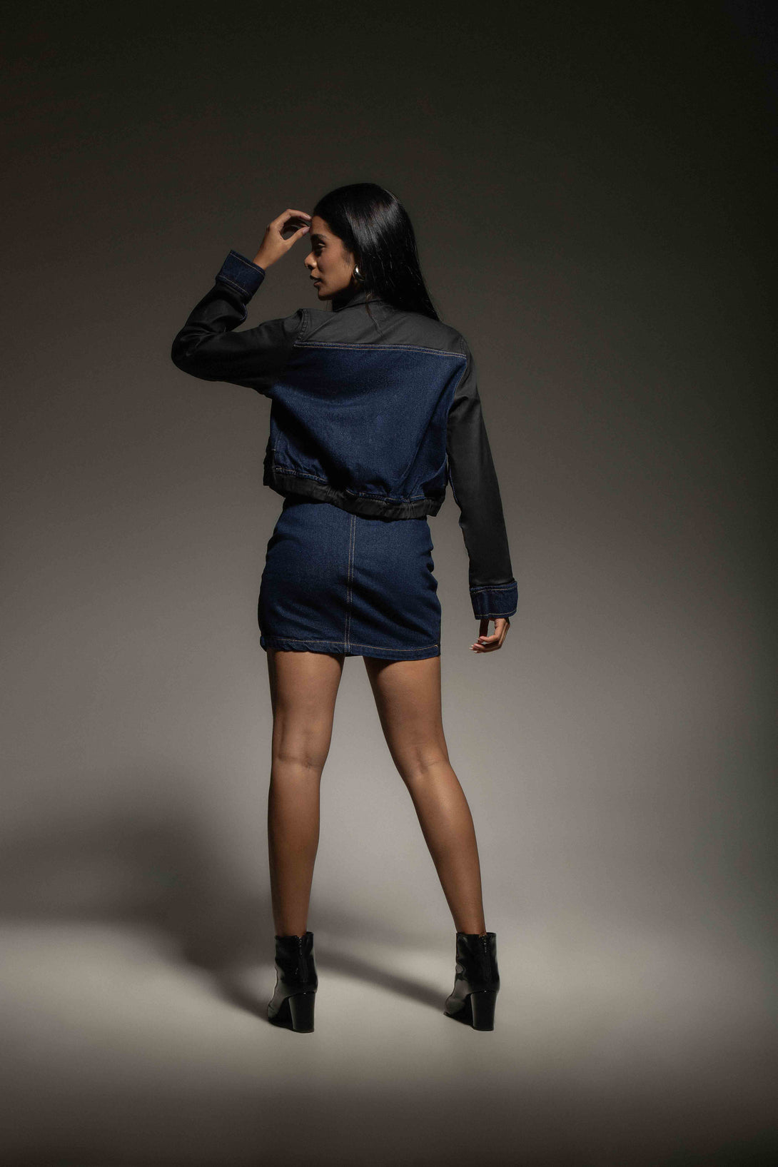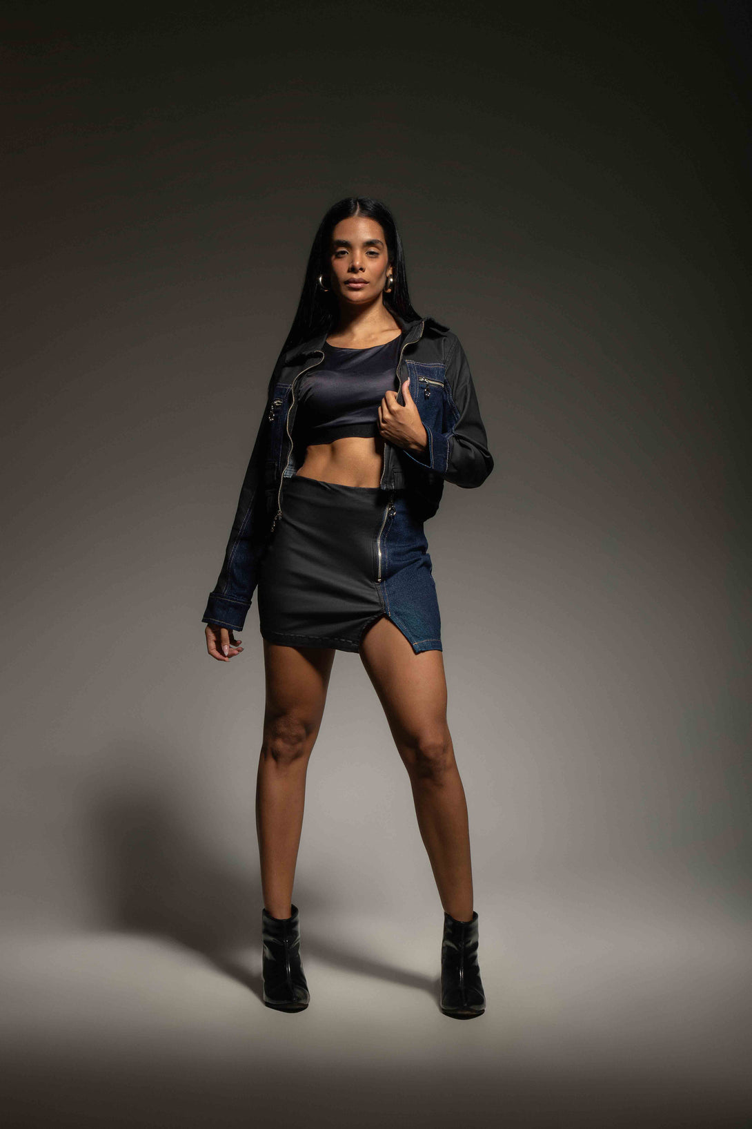 Falda de silueta mini ajustada, está confeccionada en eco-cuero con cortes laterales en denim, bajo asimétrico y cierres metálicos decorativos que refuerzan su estilo contemporáneo.