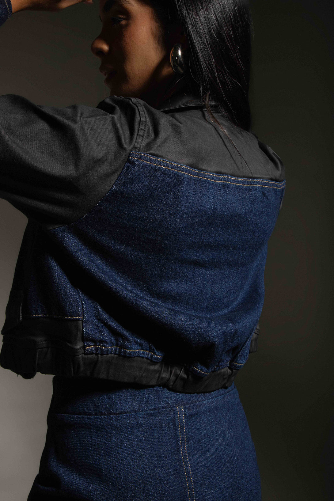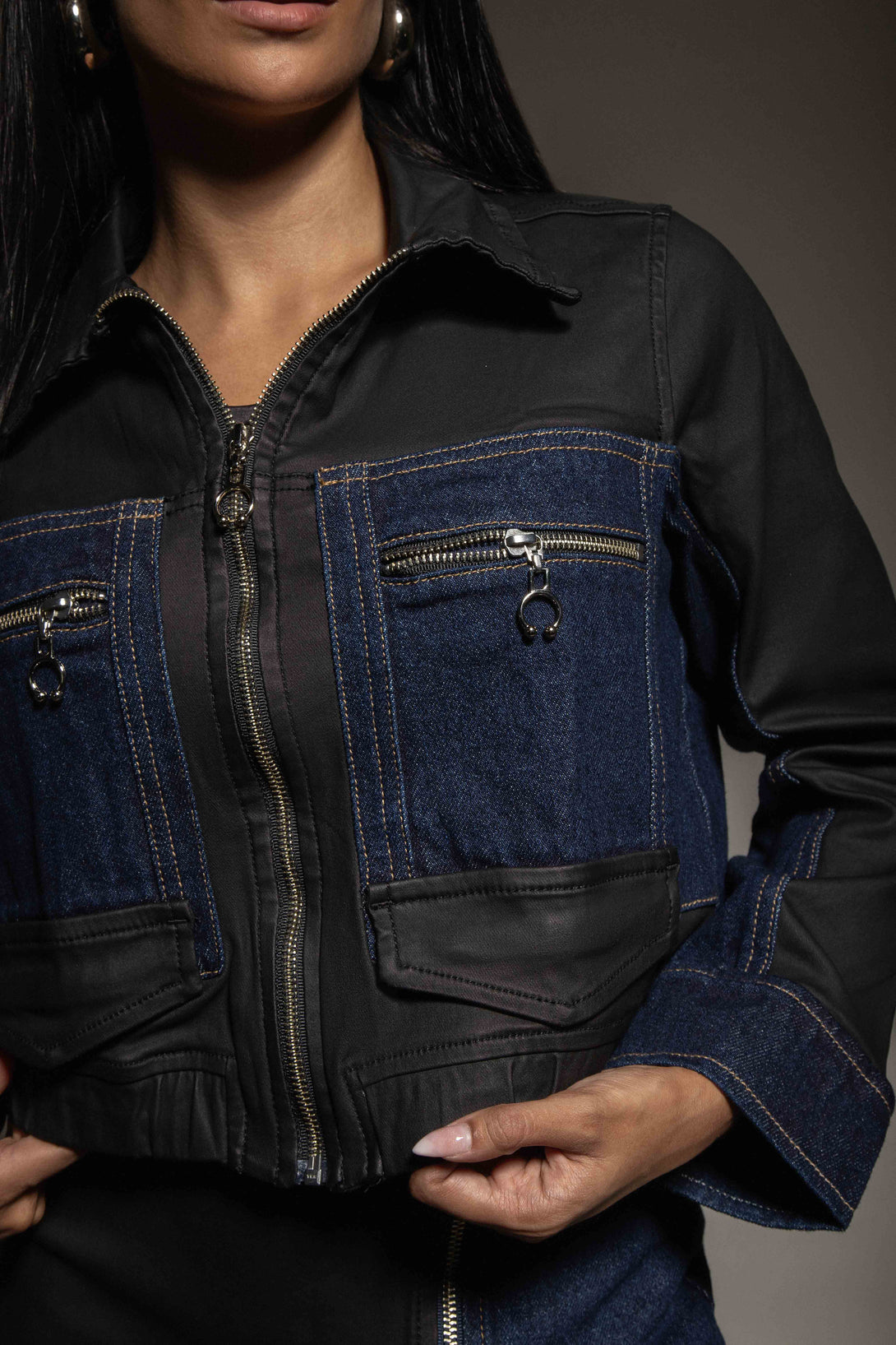 La chaqueta tiene un corte recto con cierre metálico frontal, bolsillos funcionales con cremalleras y terminación clásica, combinando paneles en denim y textil negro para un contraste moderno.