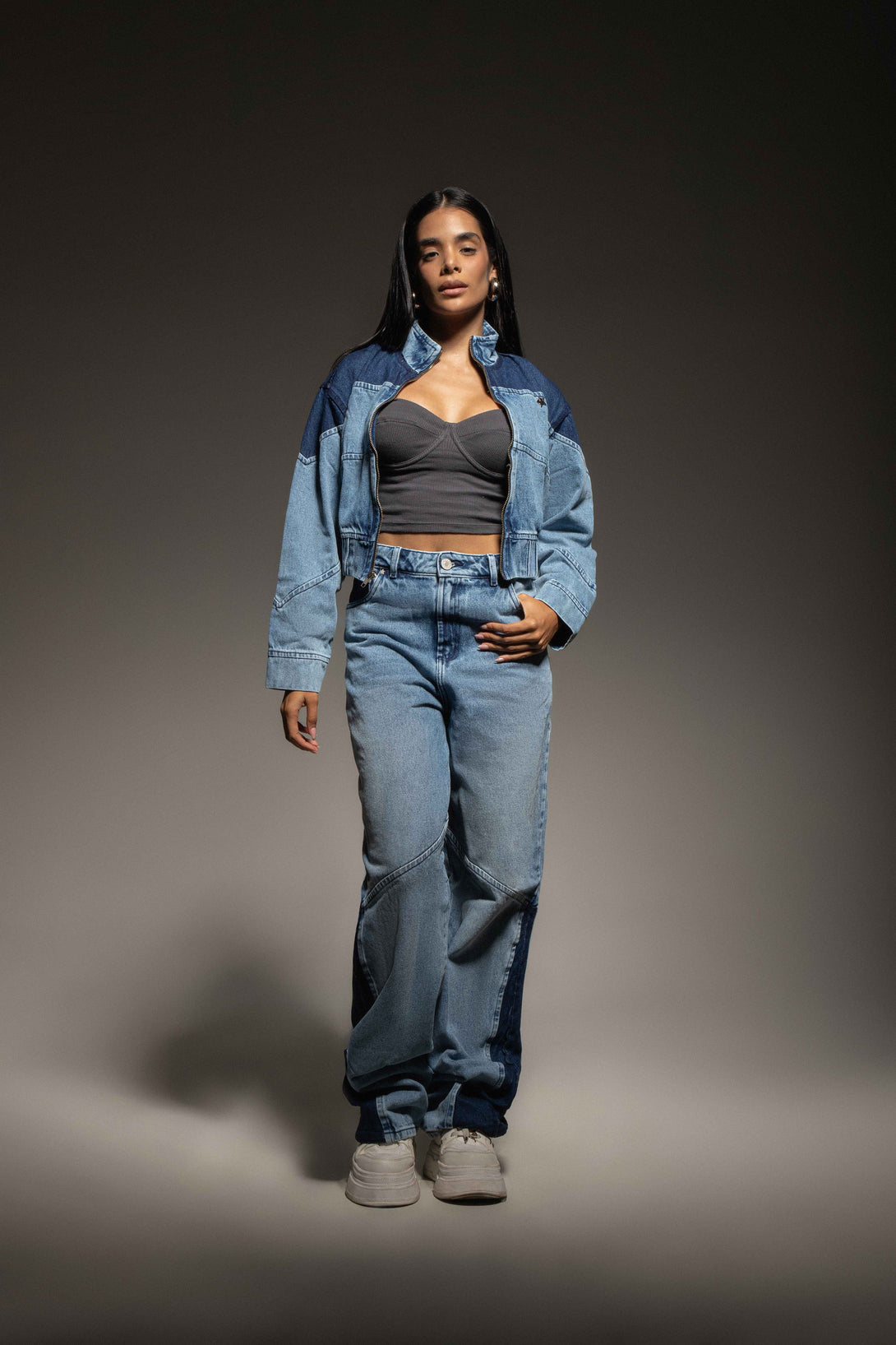 Chaqueta con cierre frontal y corte crop, confeccionada en denim de dos tonos que crean un contraste moderno, y un pantalón wide leg de tiro alto, con cortes estratégicos y detalles en bloques de color que aportan estructura y estilo.