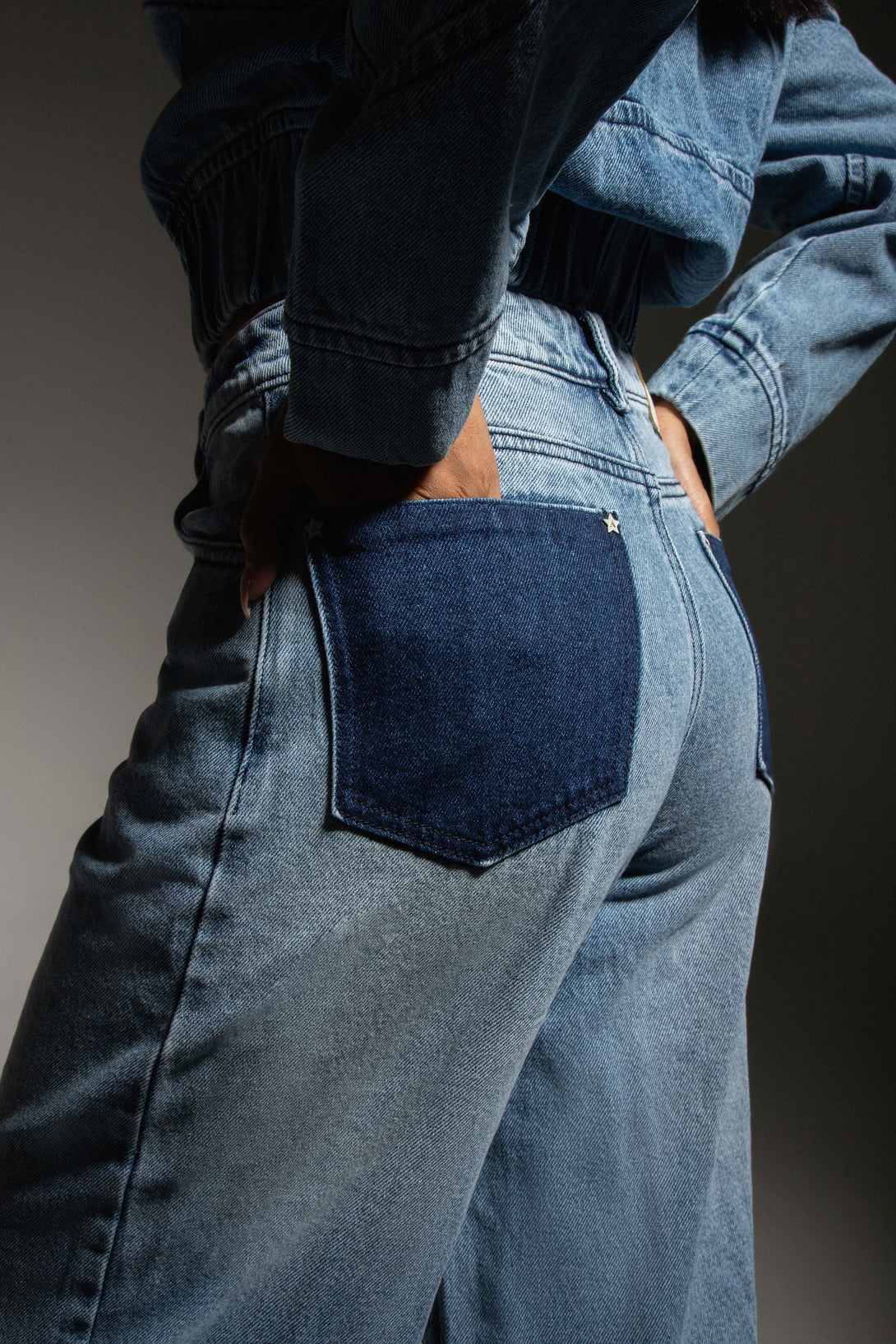 Pantalón wide leg de tiro alto, con cortes estratégicos y detalles en bloques de color que aportan estructura y estilo.