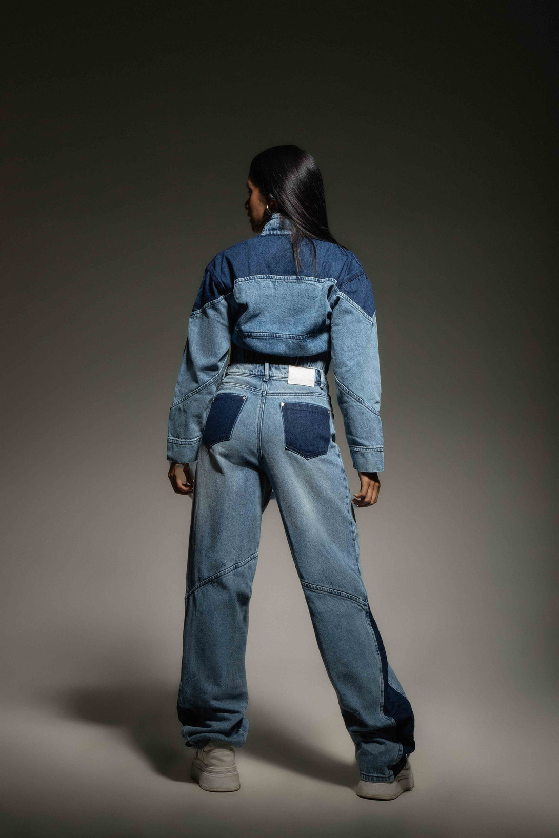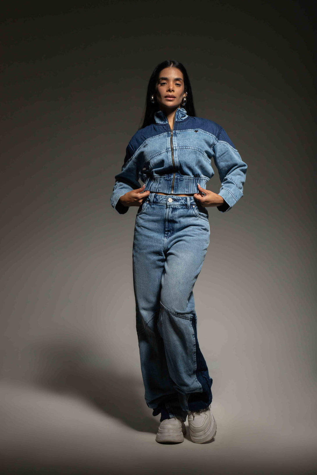 Chaqueta con cierre frontal y corte crop, confeccionada en denim de dos tonos que crean un contraste moderno