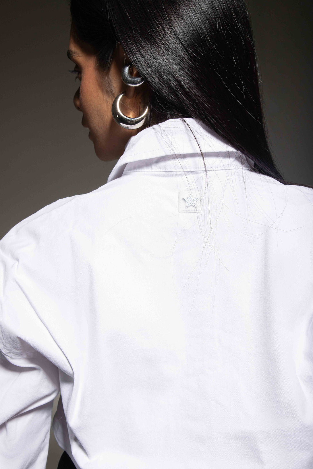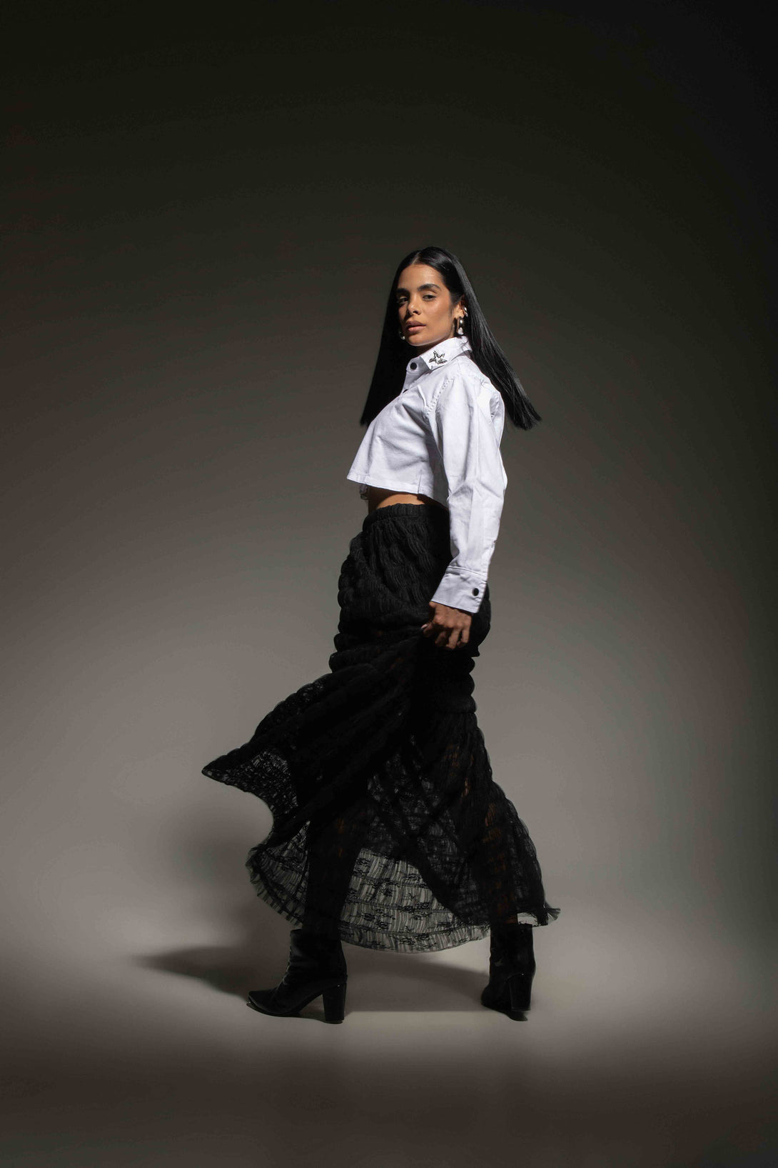Chaqueta presenta un corte crop con bolsillo frontal y botones metálicos negros, creando un contraste moderno. Su detalle estrella es el bordado con apliques brillantes en el cuello, que aporta un acento sofisticado y distintivo.