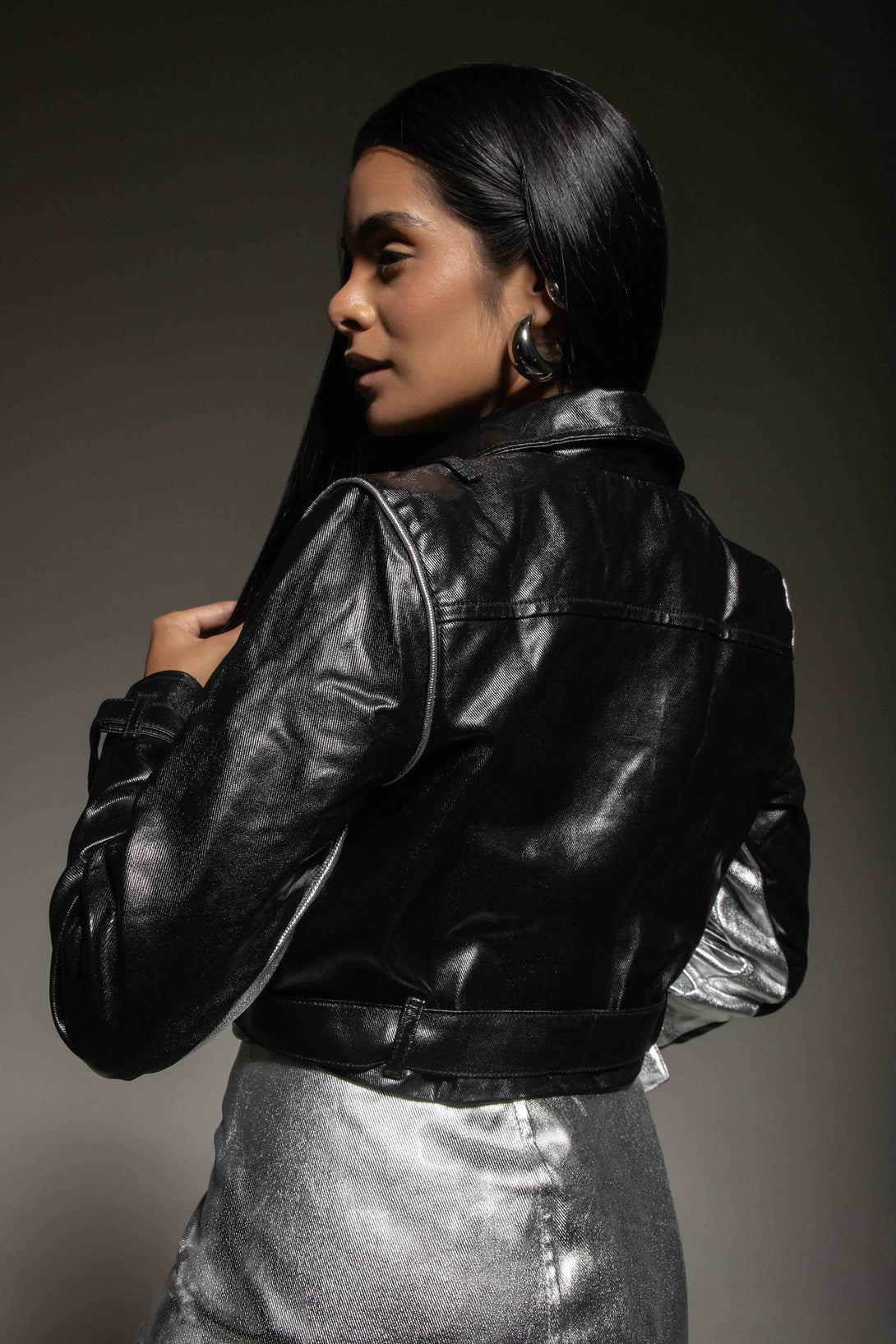 La chaqueta biker en efecto cuero negro aporta fuerza y carácter con su corte entallado y cinturón ajustable.