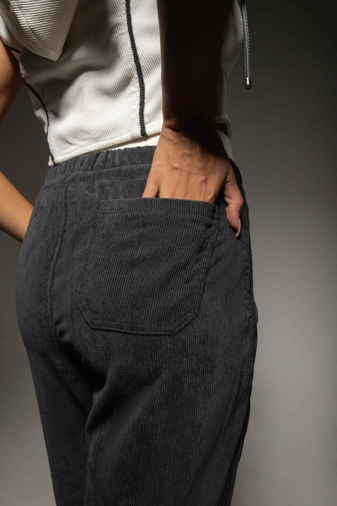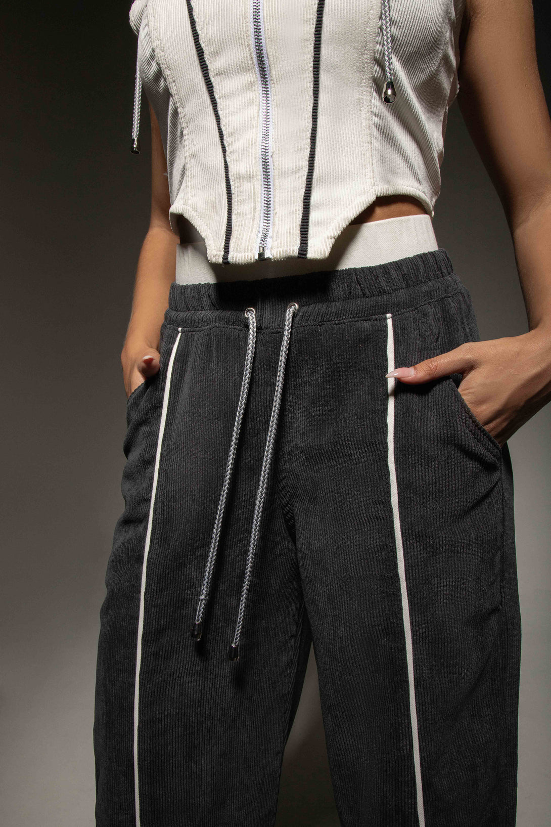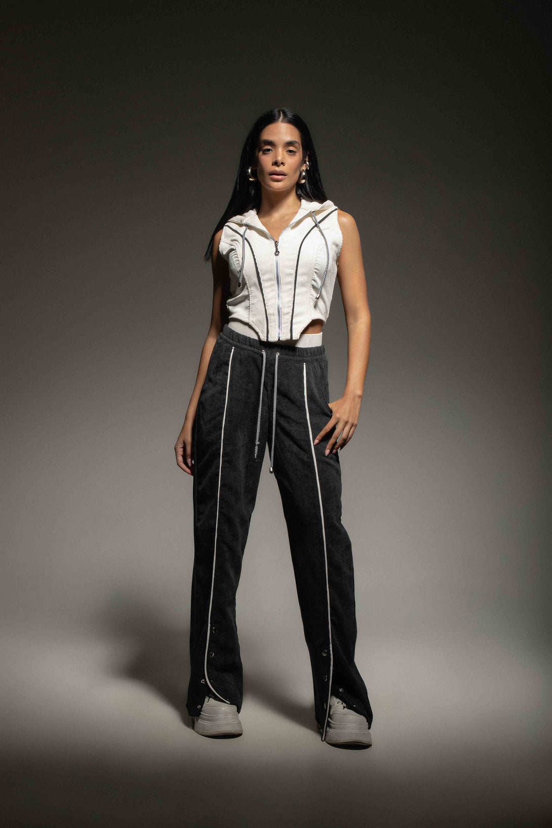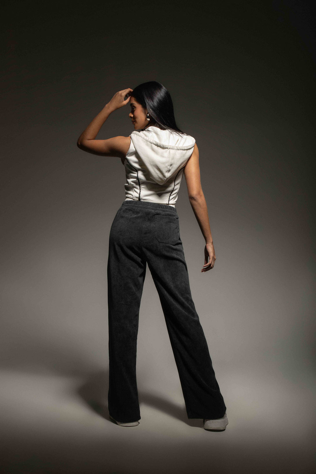 Un set de chaleco crop con capota tiene un fit ajustado tipo corset, con líneas de costura que estilizan y una cremallera frontal que aporta un toque edgy. Su tono blanco hueso contrasta perfecto con el pantalón gris de silueta recta, pretina cómoda y pespuntes verticales que alargan la figura.