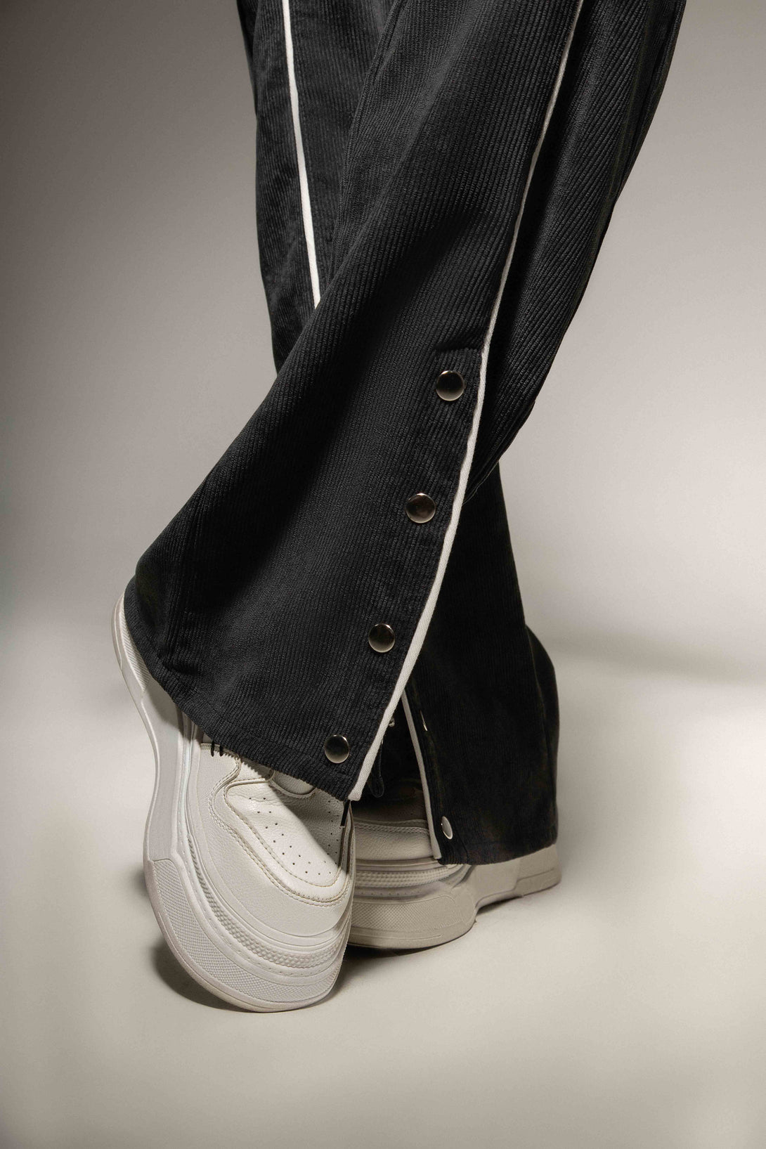 El pantalón incluye bolsillos con cremallera y aberturas inferiores con botones, aportando versatilidad y movimiento al look.