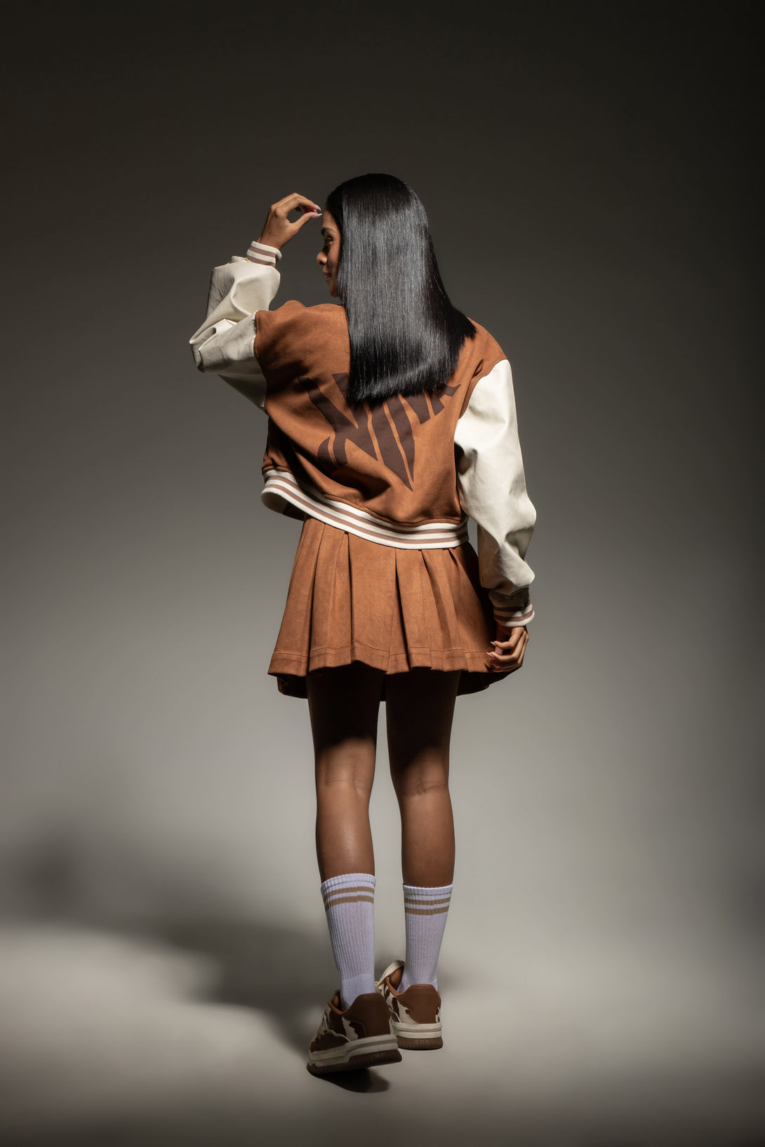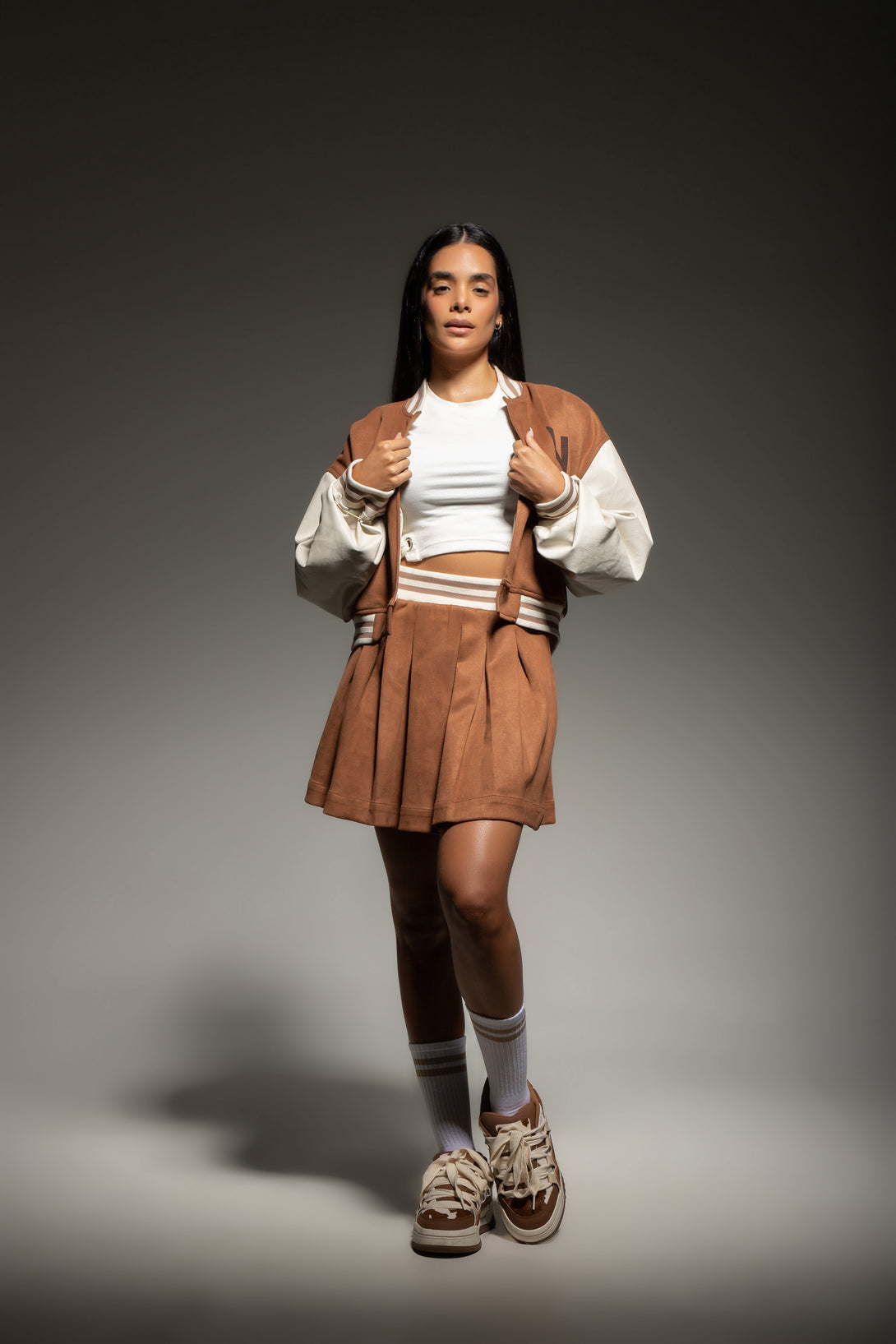 Falda tipo skort plisada en ante café con pretina en fajon tejido a tono.