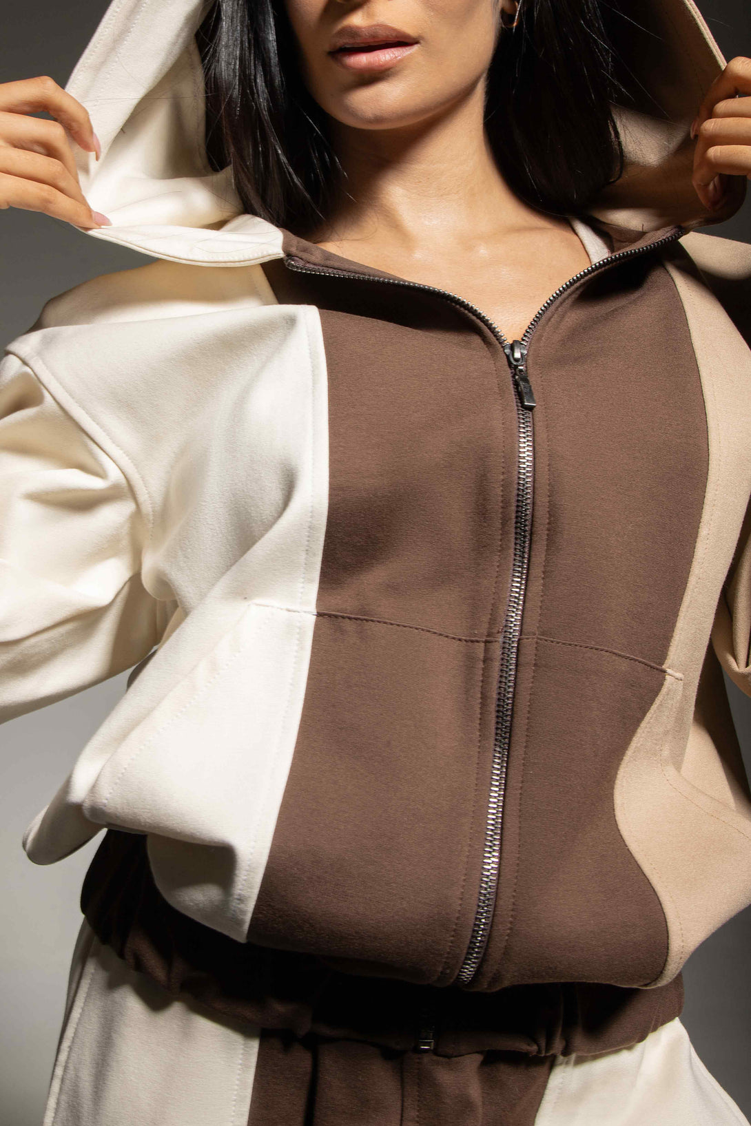 a chaqueta presenta un diseño color block en tonos crema, beige y café chocolate, con cierre frontal metálico y capucha ligera que aporta comodidad sin perder estructura. Sus mangas tienen cortes asimétricos que realzan la silueta y le dan un look urbano distintivo.