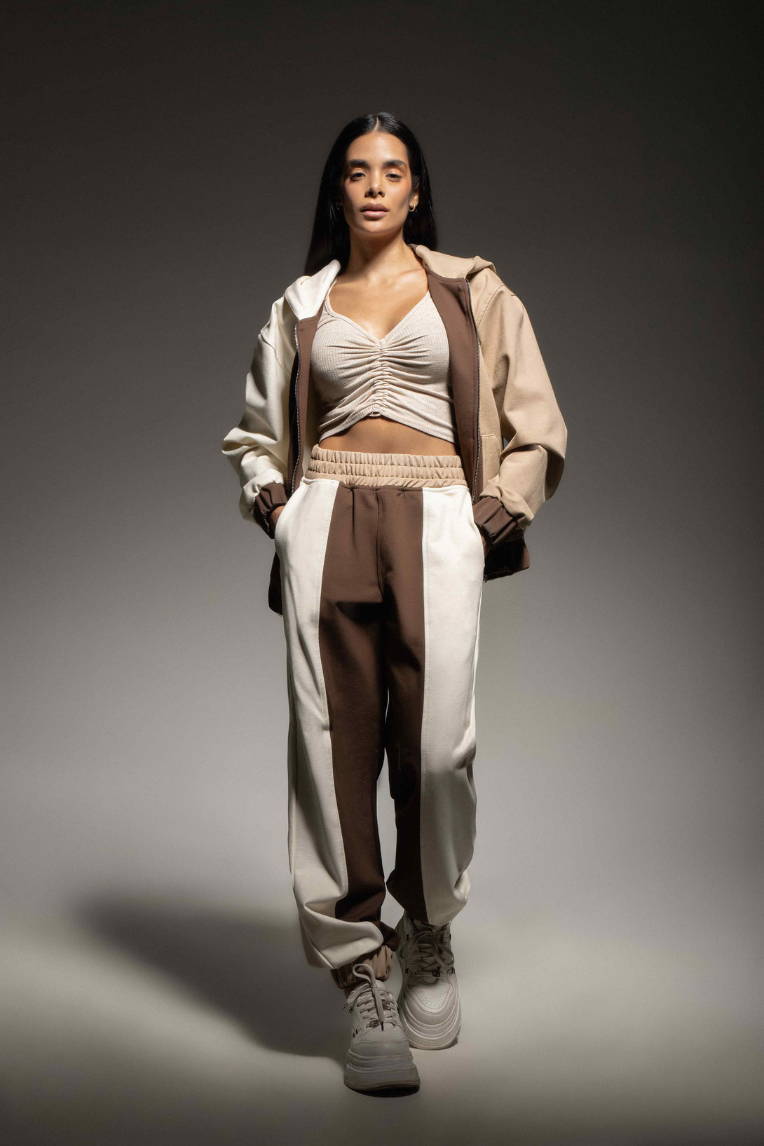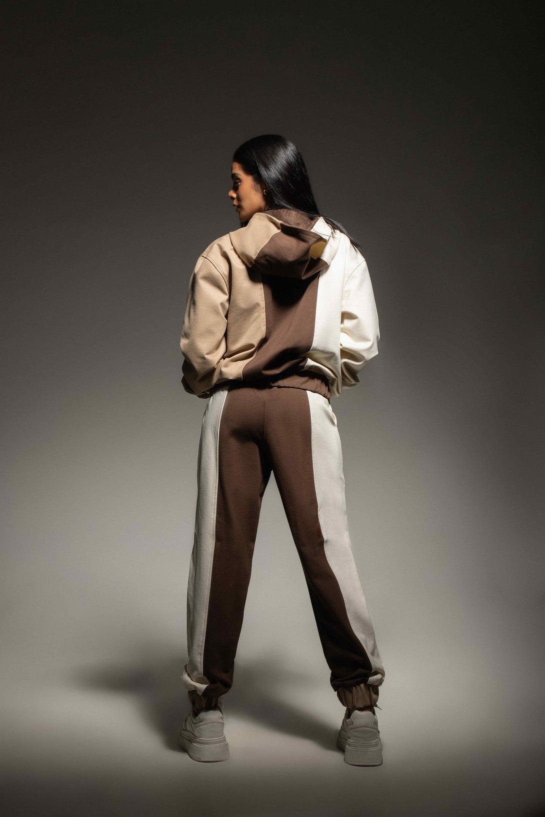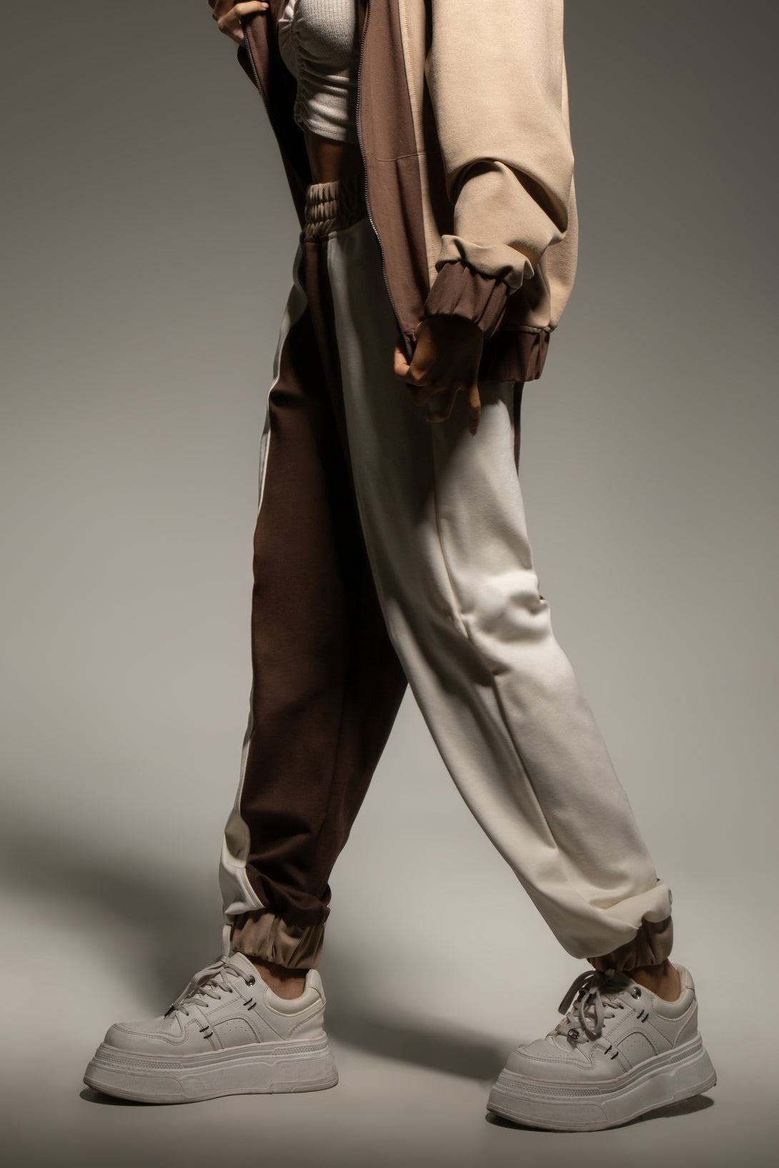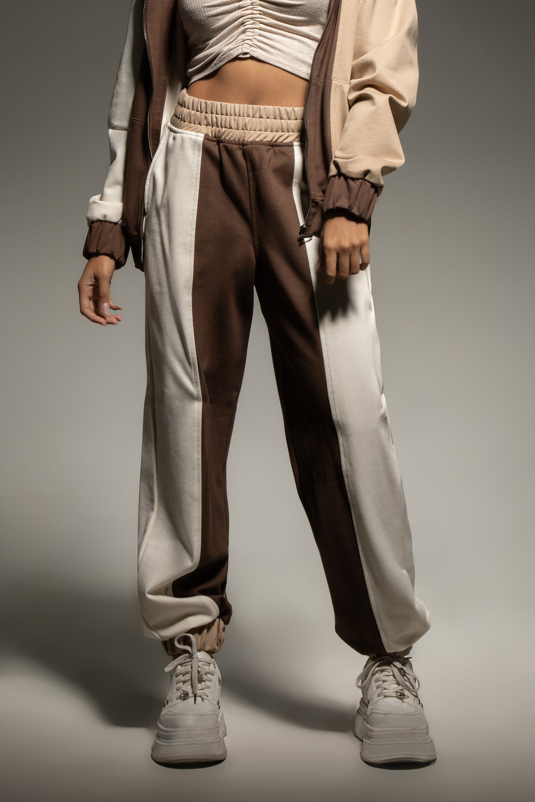 El pantalón, confeccionado en el mismo tejido suave y resistente, replica el juego de bloques de color creando una línea visual vertical que estiliza la figura. Posee pretina elástica, ajuste cómodo y botadores en los tobillos que mantienen la forma del jogger.