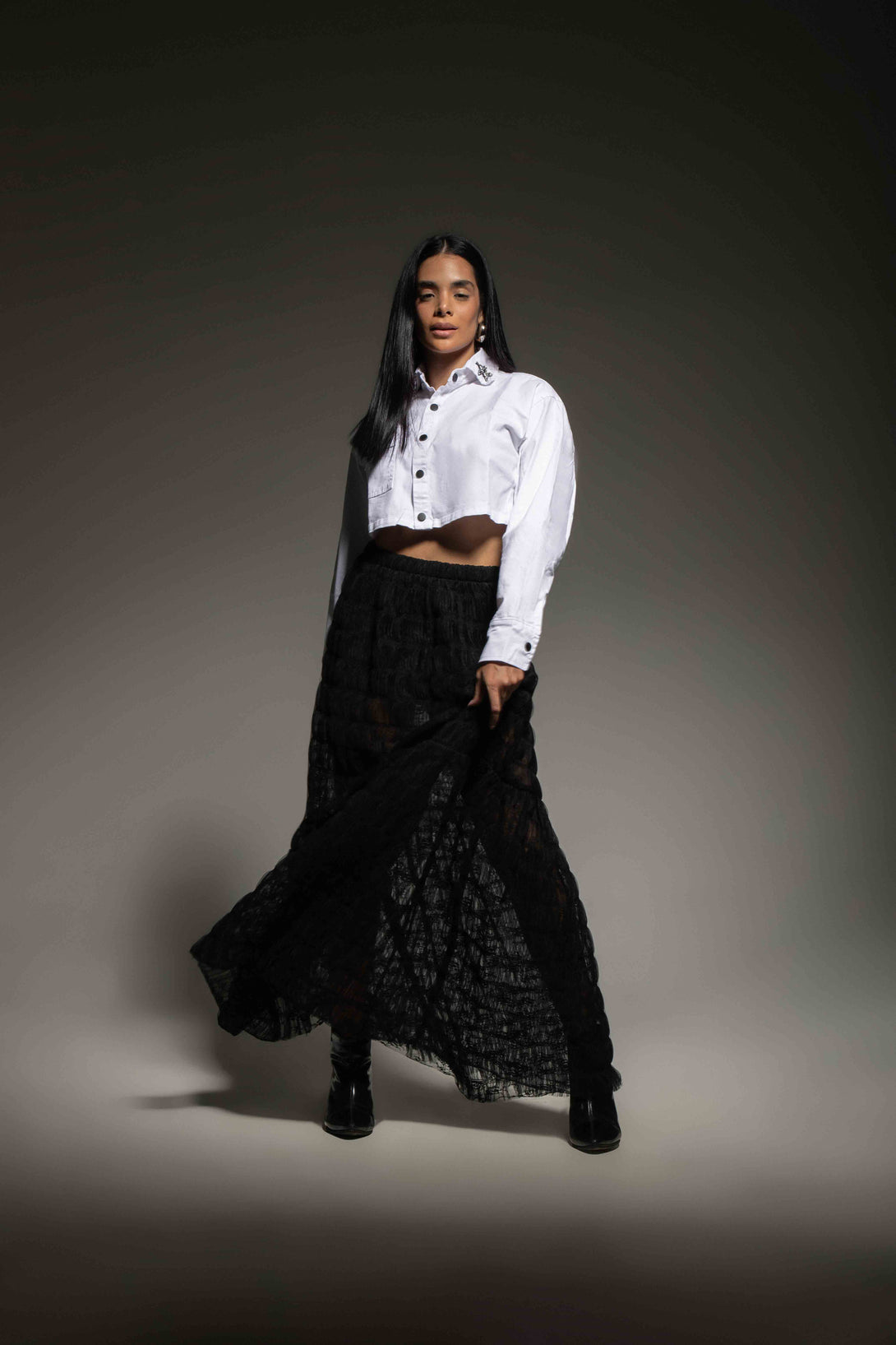 Esta falda maxi está confeccionada en un tejido traslúcido con textura ligera y efecto de movimiento, lo que le aporta un aire etéreo y elegante. Su pretina elástica asegura comodidad y un ajuste versátil, mientras que el diseño fluido permite crear looks que van desde lo bohemio-chic hasta lo urbano sofisticado.
