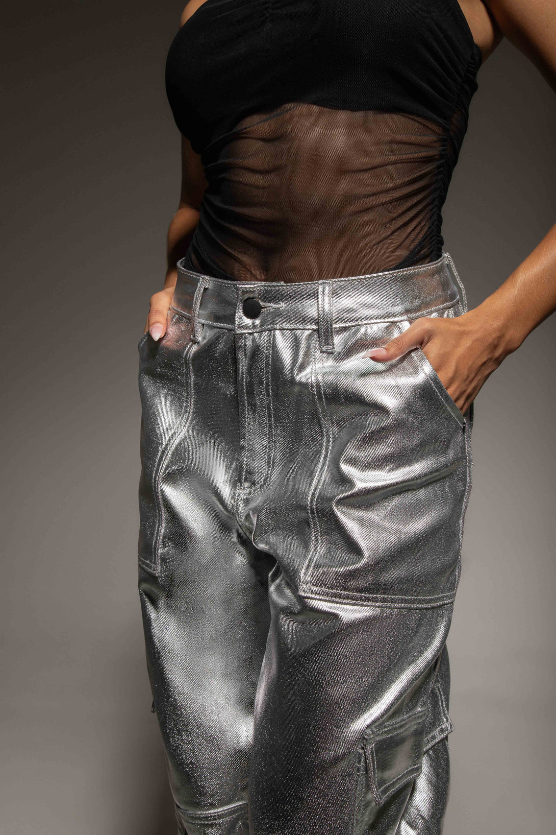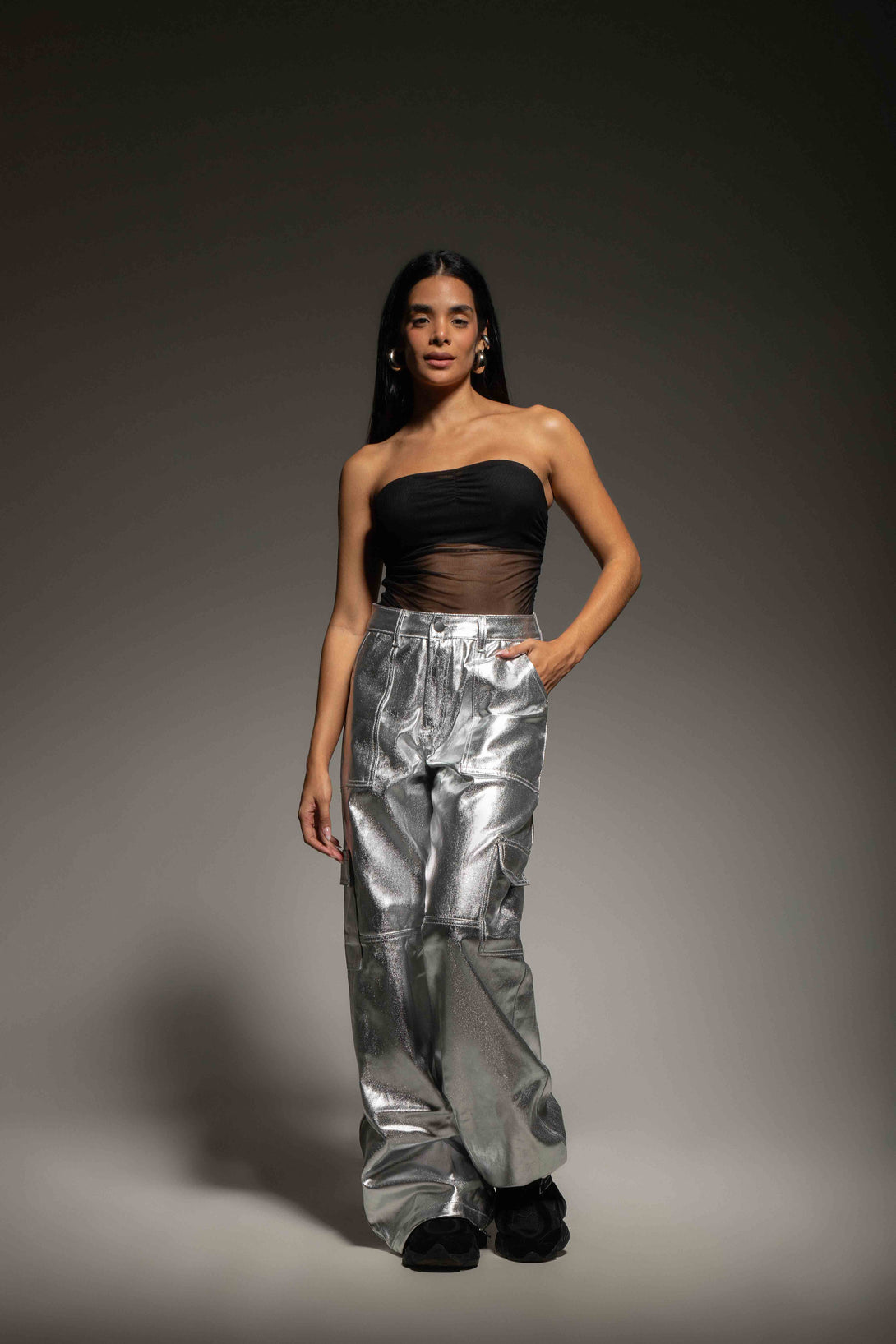 Un básico elevado al siguiente nivel. Este cargo de silueta relaxed fusiona comodidad y vanguardia gracias a su acabado metalizado plateado que aporta un brillo audaz y futurista. Con bolsillos amplios de inspiración utilitaria y pretina ajustada para mayor confort, es una prenda versátil que se adapta tanto a un look streetwear de impacto como a combinaciones más sofisticadas.