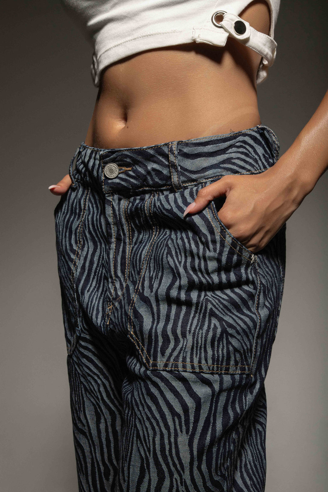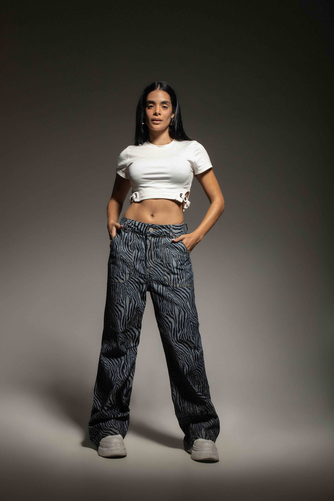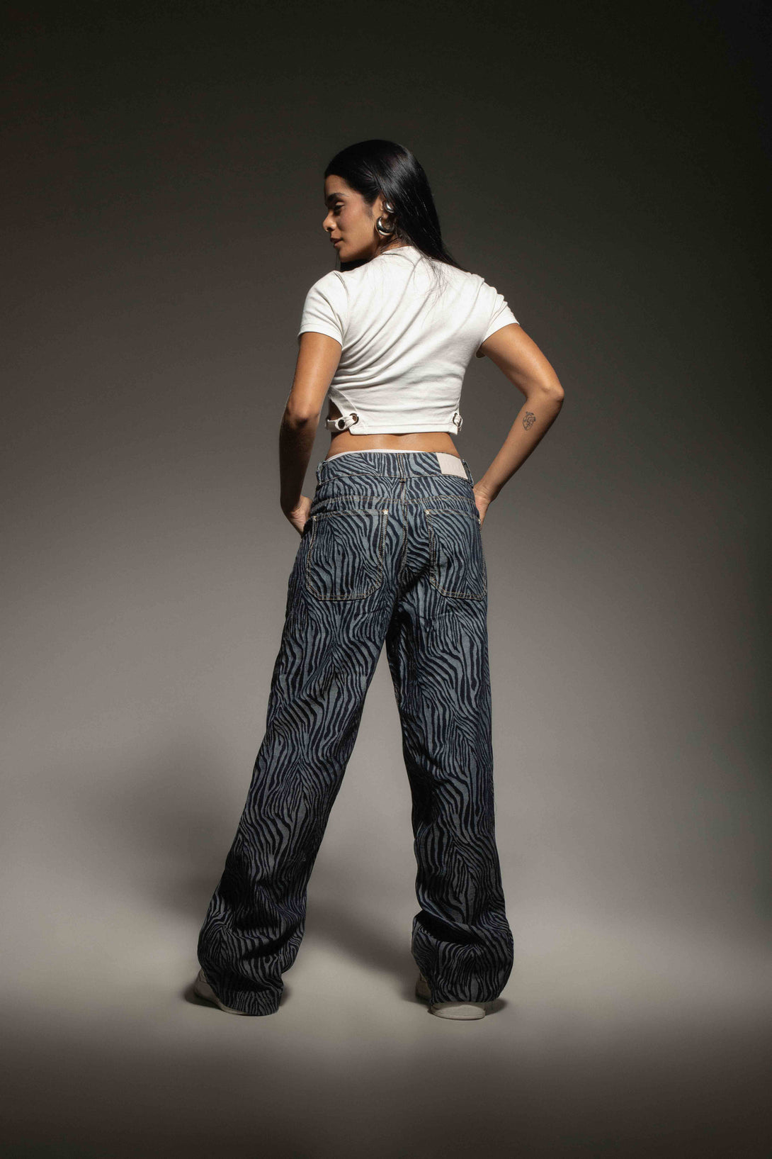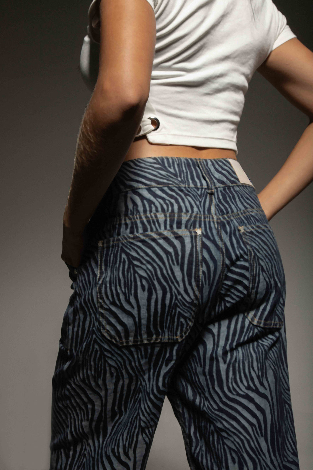 Silueta wide leg de tiro medio, este pantalón resalta por su estampado tipo animal print en tonos índigo con contraste negro, aportando un aire urbano y sofisticado. Su confección en denim 100%algodon de 10 oz ofrece una calidad premium mientras que los bolsillos delanteros amplios y costuras marcadas le suman un detalle utilitario.