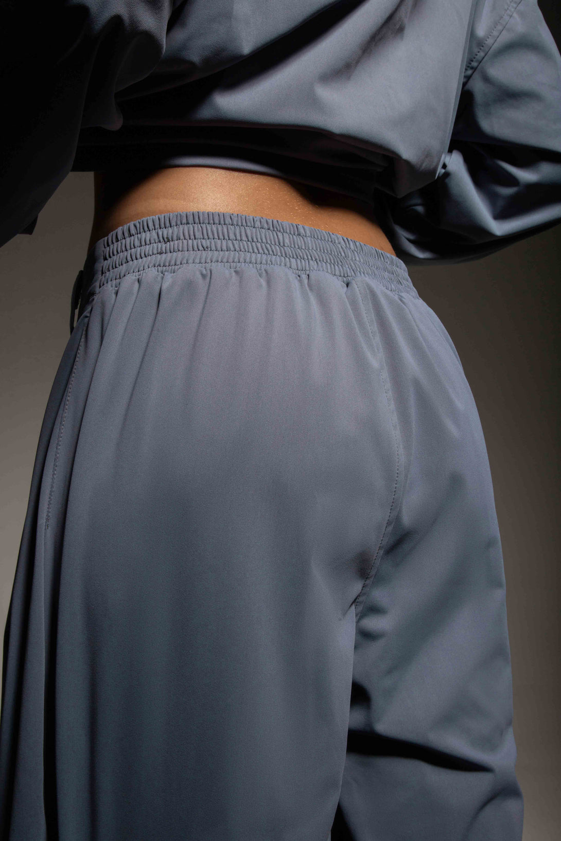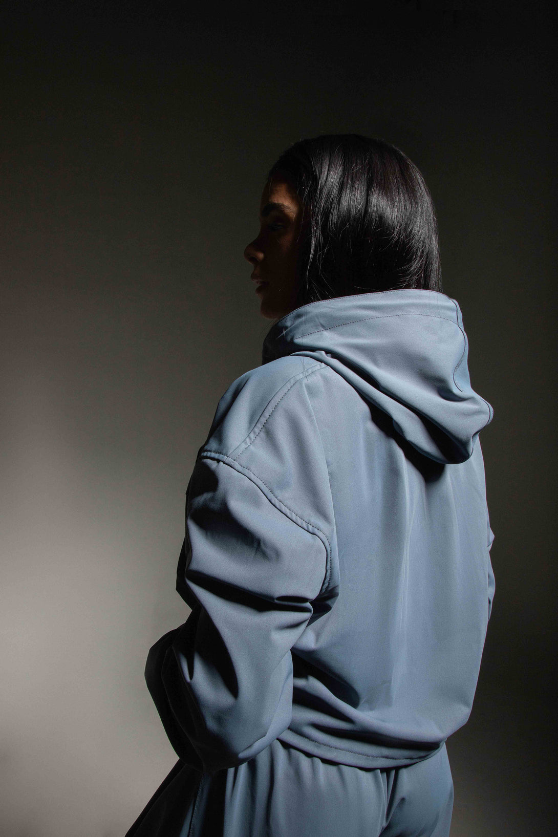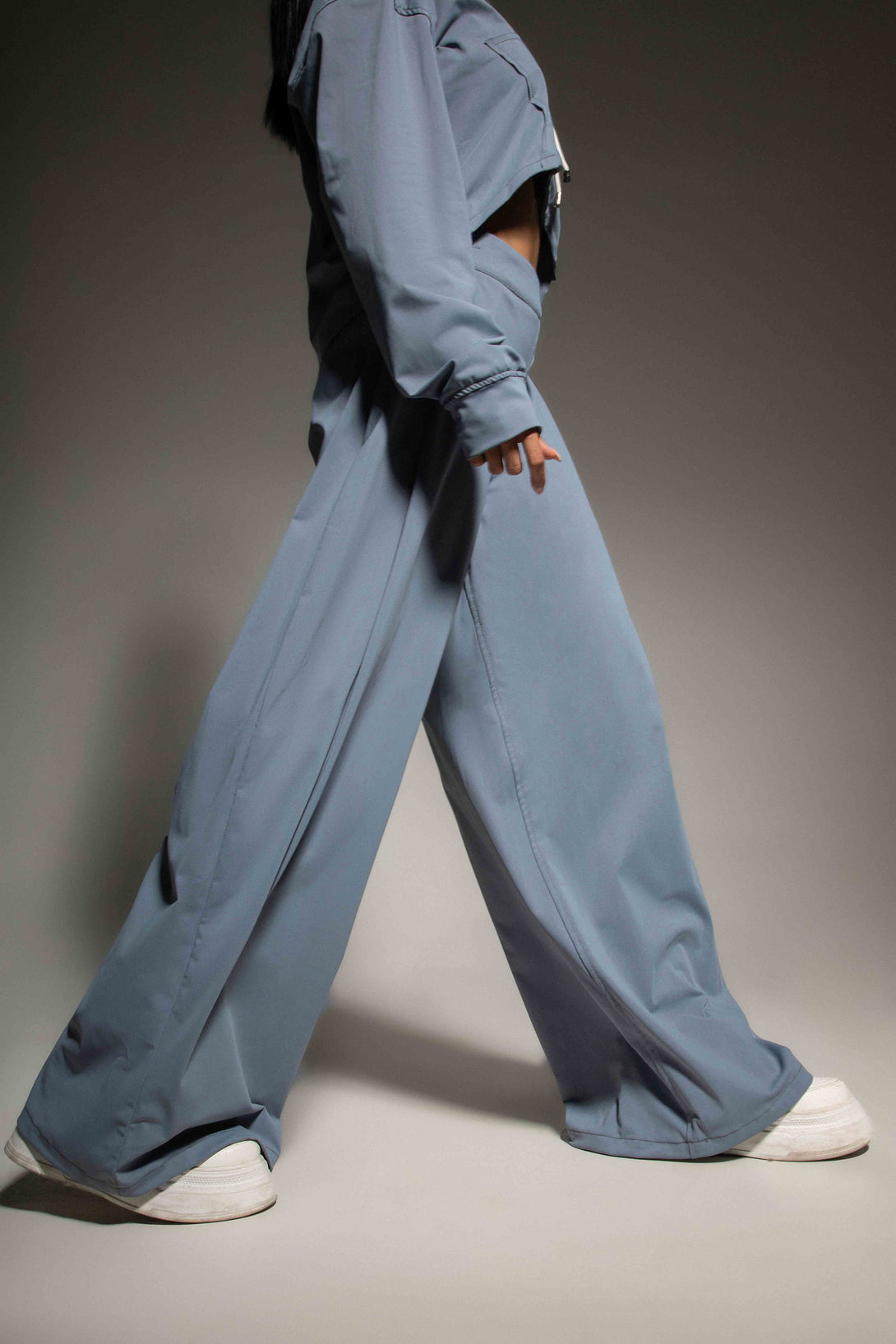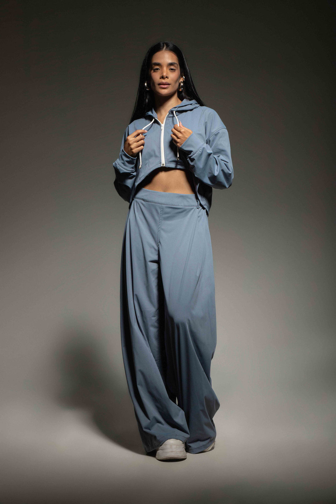 Conjunto en tono azul celeste compuesto por chaqueta corta tipo crop con capucha y pantalón de tiro alto. La chaqueta tiene una silueta amplia con cierre frontal en cremallera, cordones decorativos en el cuello. Está confeccionada en tejido plano con tacto suave y estructura ligera que brinda comodidad y movilidad. El pantalón, de corte amplio tipo wide leg, cuenta con pretina anatómica, pinzas que aportan una caída fluida y pretina posterior enresortada.