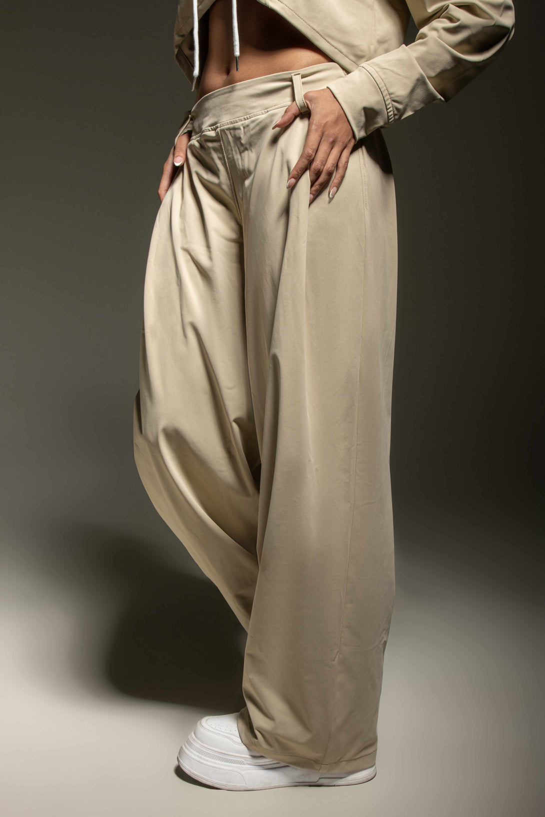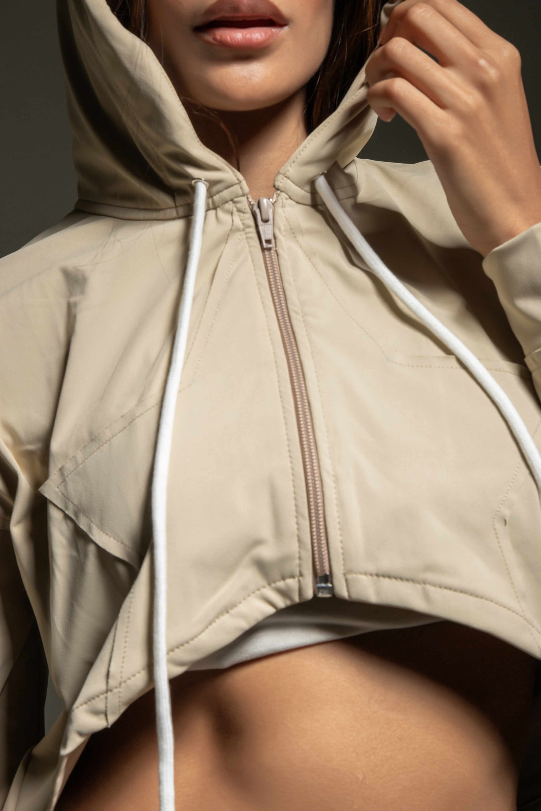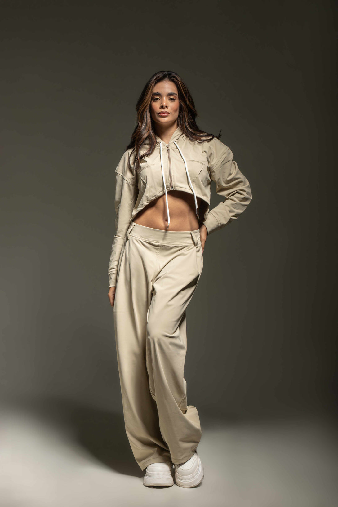 Conjunto en tono beige compuesto por chaqueta corta tipo crop con capucha y pantalón de tiro alto. La chaqueta tiene una silueta amplia con cierre frontal en cremallera, cordones decorativos en el cuello. Está confeccionada en tejido plano con tacto suave y estructura ligera que brinda comodidad y movilidad. El pantalón, de corte amplio tipo wide leg, cuenta con pretina anatómica, pinzas que aportan una caída fluida y pretina posterior enresortada.