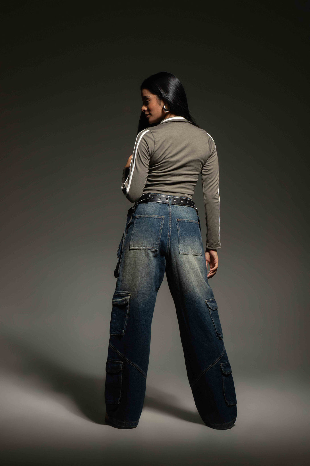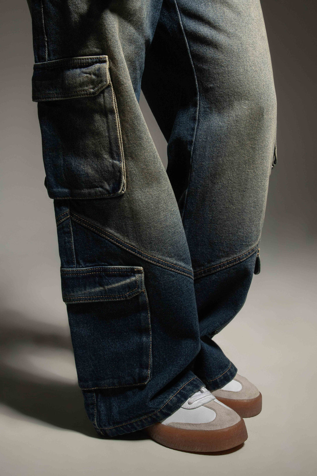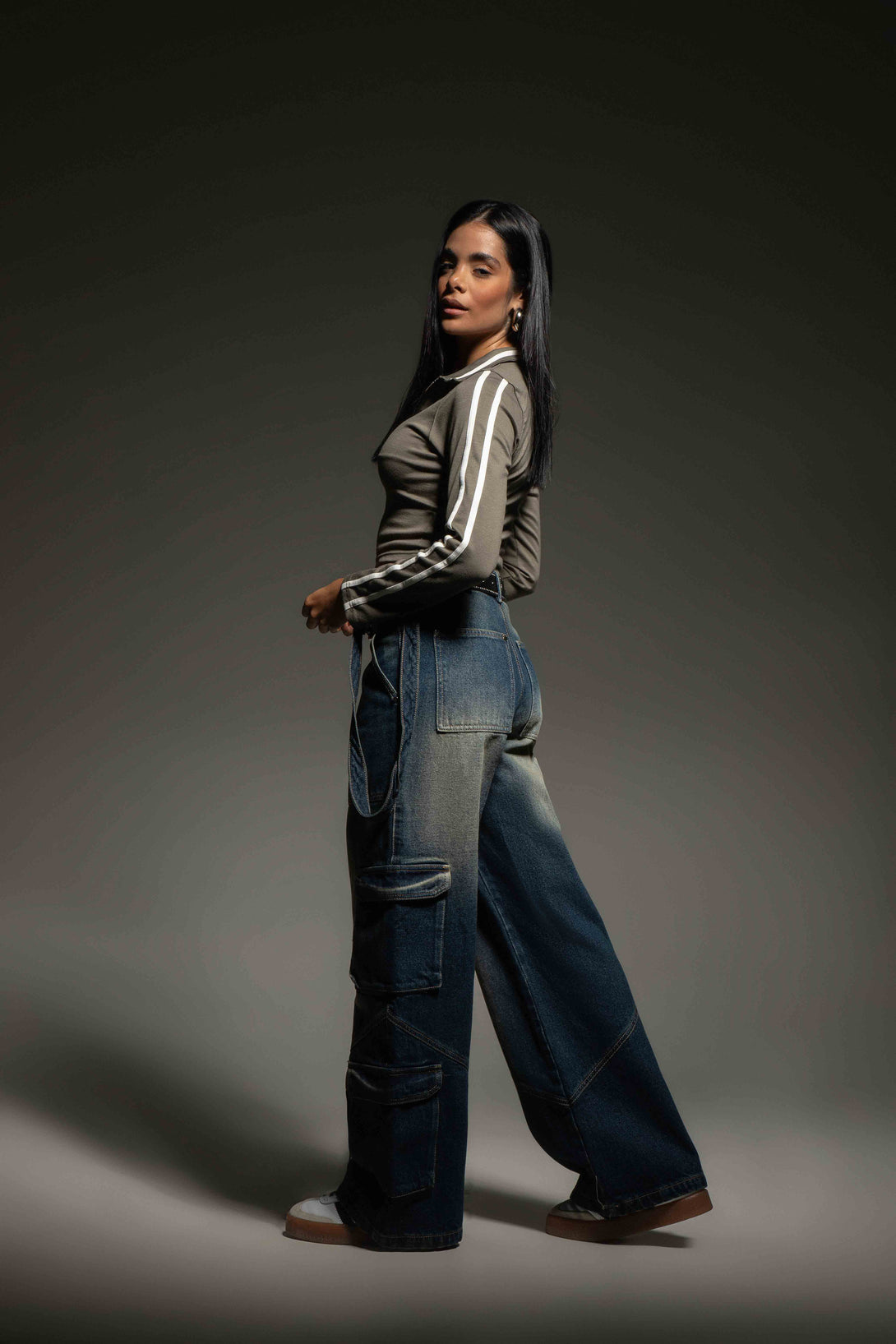 El jean, elaborado en denim azul oscuro 100%algodon con efecto degradado y costuras marcadas, tiene silueta wide leg, tiro medio y múltiples bolsillos tipo cargo que le dan un estilo utilitario