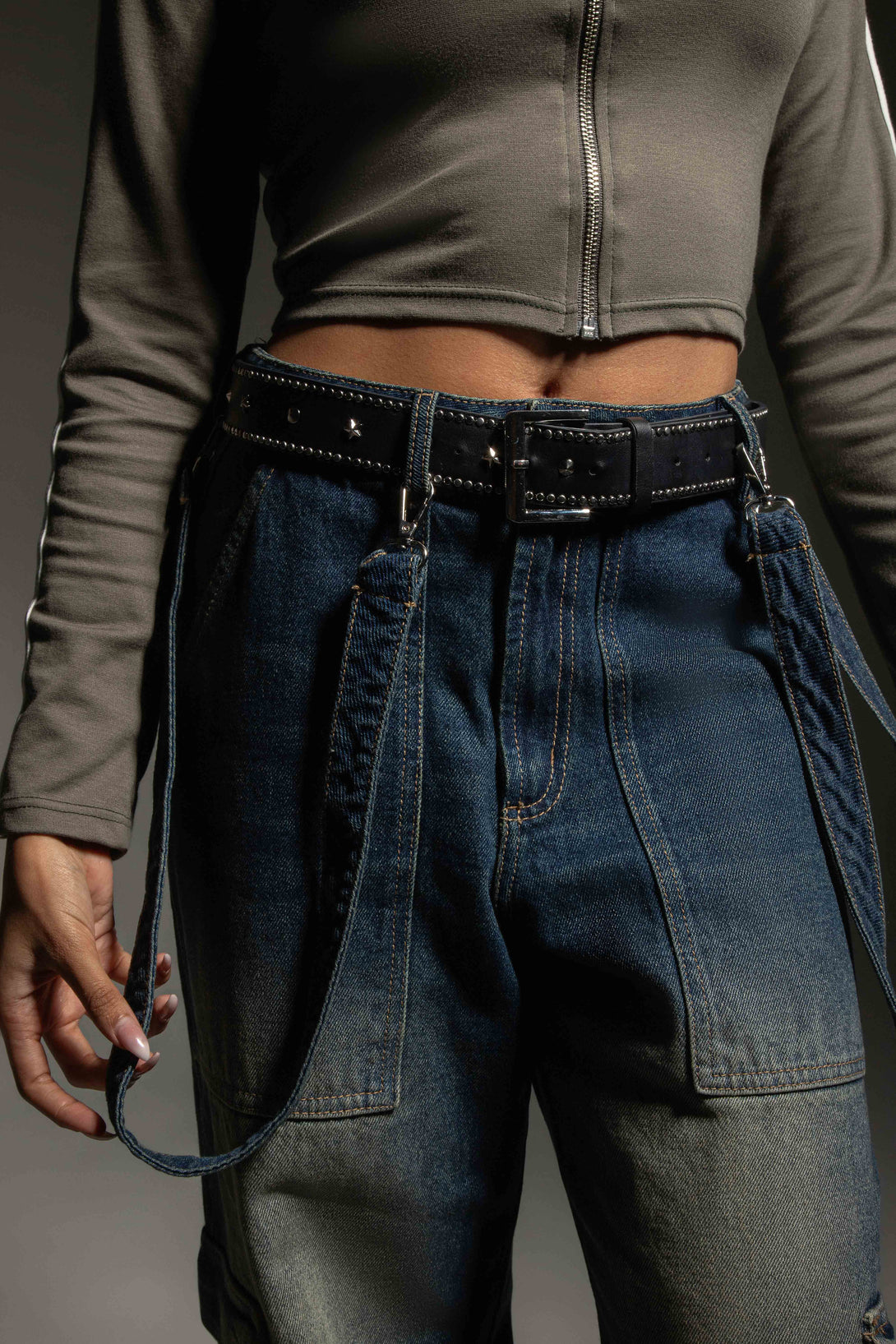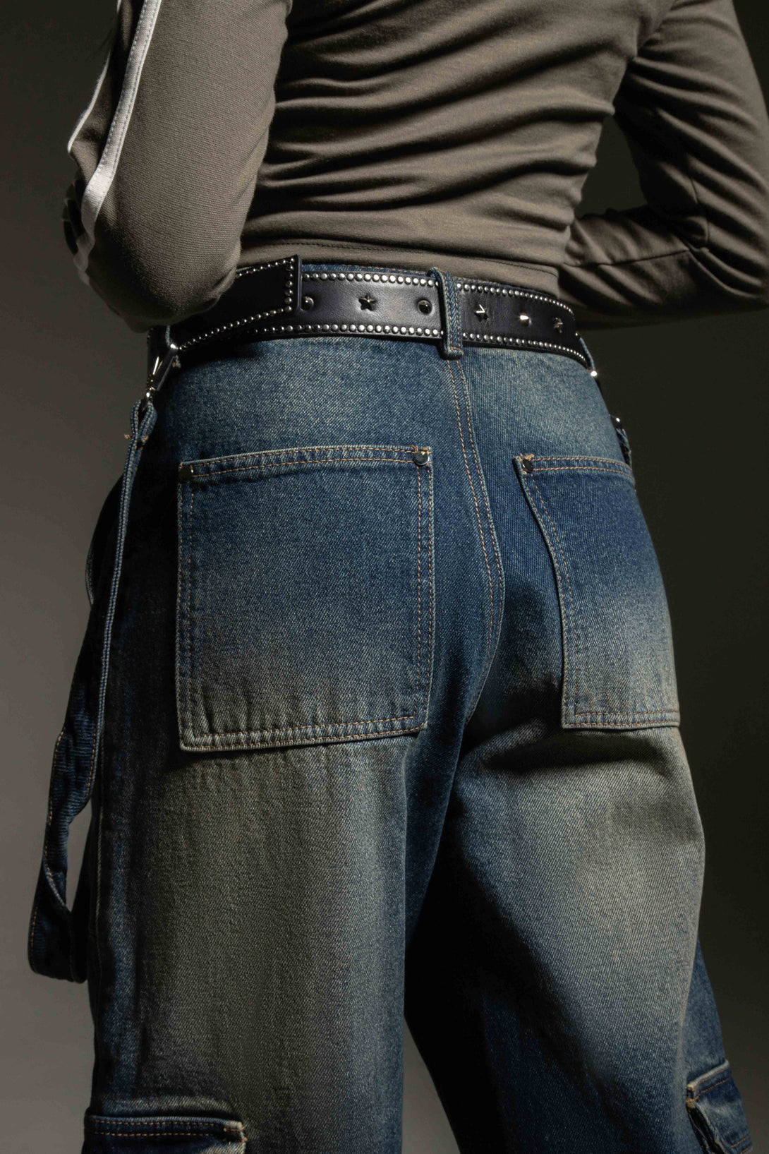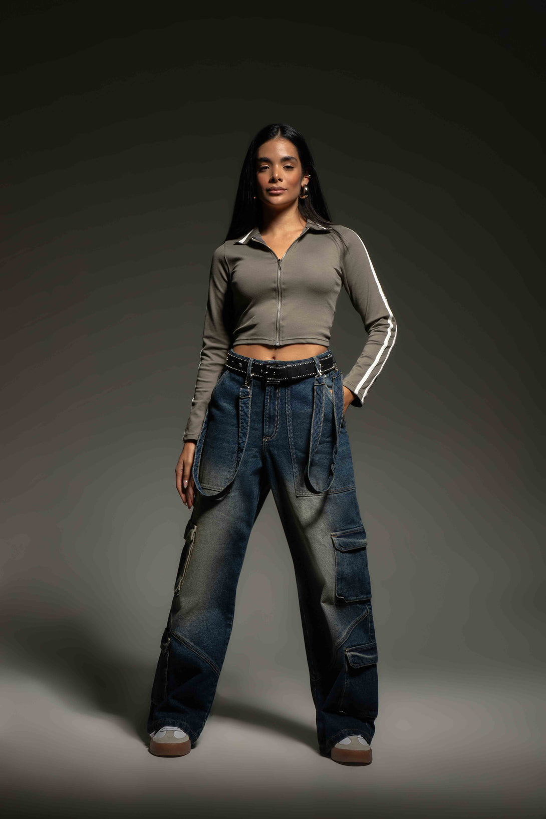 El jean, elaborado en denim azul oscuro 100%algodon con efecto degradado y costuras marcadas, tiene silueta wide leg, tiro medio y múltiples bolsillos tipo cargo que le dan un estilo utilitario