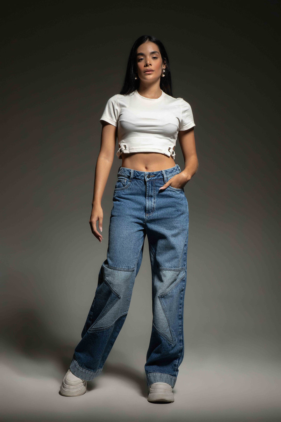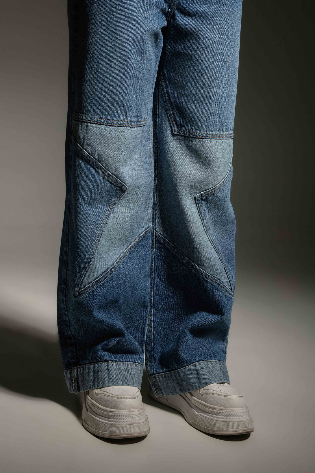 Un jean de diseño estructurado con silueta wide leg y construcción en denim mixto de dos lavados,incluye paneles en forma de estrella en ambas piernas, elaborados con cortes geométricos y pespuntes visibles que realzan la estructura del diseño.
