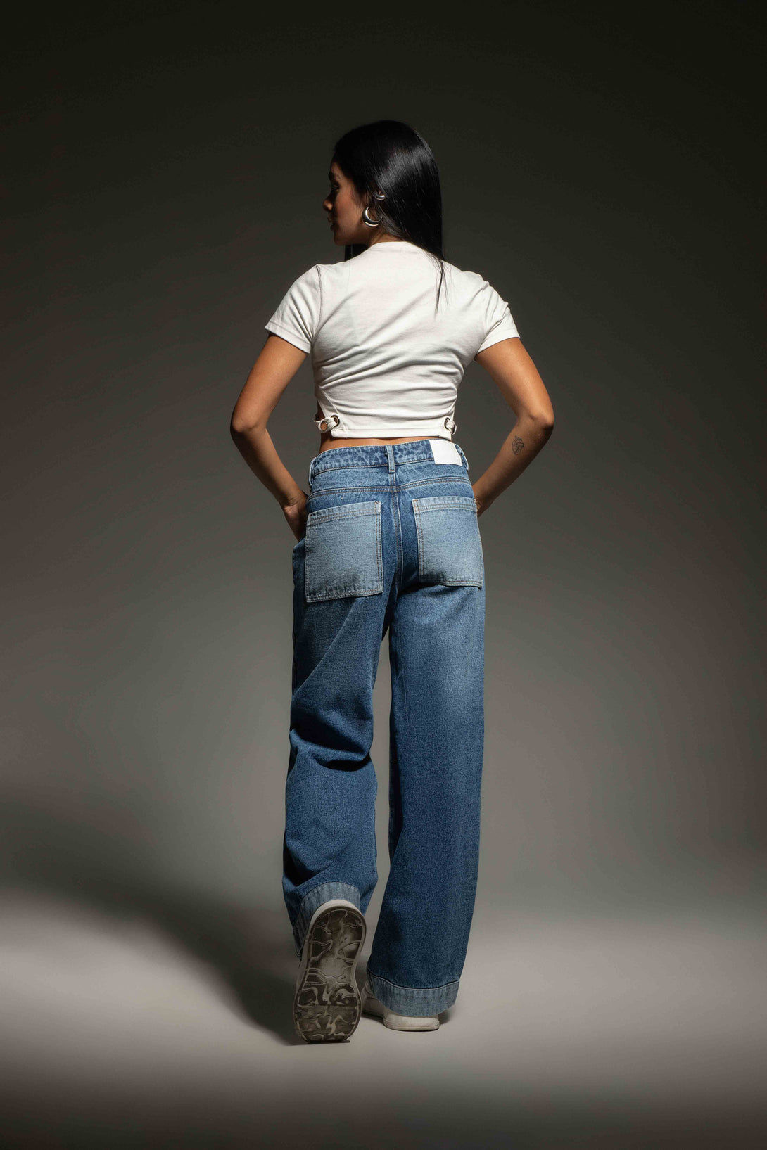 La pretina es clásica, con tiro medio–alto,cuenta con bolsillos funcionales delanteros y traseros, cierre frontal metálico y costuras reforzadas para mayor durabilidad.